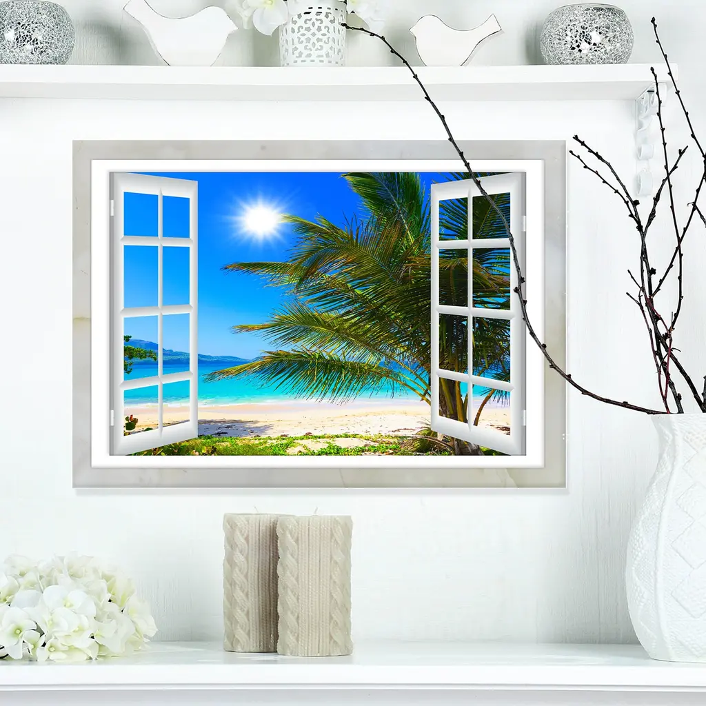 Bring contemporary abstraction to your home with this large 36W x 28H Metal Wall Art. This Window Open to Beach with Palm Metal Artwork makes it the focal point of any room or office. - White gloss coating ensures colors are extra vibrant with light reflection.- Aluminum grade sheet metal with 1-inch mounting frame on the back giving the illusion that the artwork is floating on the wall.- Mounting brackets are included along with instructions.- High quality digital images are created directly into a glossy aluminum panel producing a stunning and captivating print into the glossy finish of the metal.- Water, fire and scratch resistant HD aluminum panels.- Looks better than any photo paper and guaranteed to last at least 20 years- Easy to clean with a microfiber cloth. Colors are far superior to regular canvas art. - Easy to hang