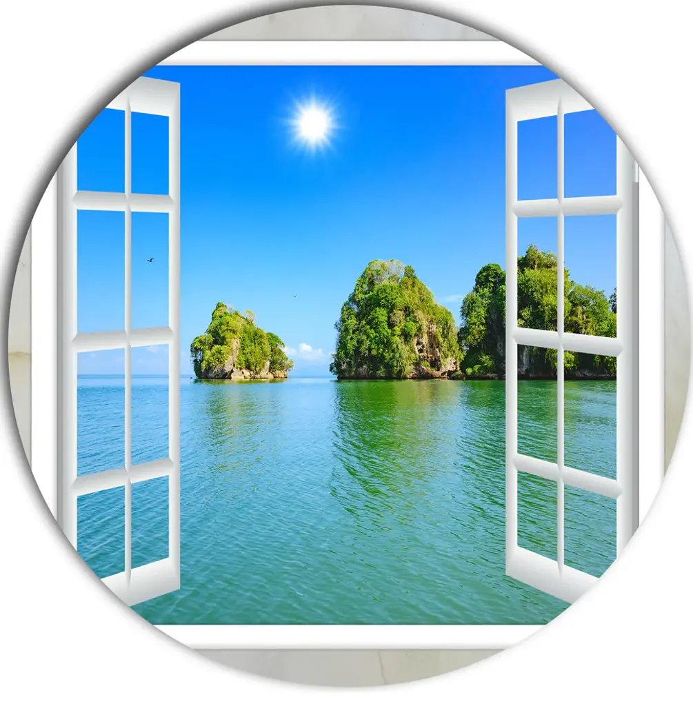 Bring Contemporary Abstraction to your home with this large Circle Metal wall art. This Window to Beach with Coconut Palms Metal Artwork makes it the focal point of any room or office. - White Gloss Coating ensures colors are extra vibrant with light reflection.- Aluminum grade Sheet Metal with 1 inch mounting frame on the back giving the illusion that the artwork is floating on the wall..- Mounting Brackets are included along with instructions.- High Quality Digital images are created directly into a glossy aluminum panel producing a stunning and captivating print into the glossy finish of the metal.- Water, Fire and Scratch resistant HD Aluminum panels.- Looks better than any photo paper and guaranteed to last at least 20 years- Easy to clean with a microfiber cloth. Colors are far superior to regular Canvas Art. - Easy to Hang