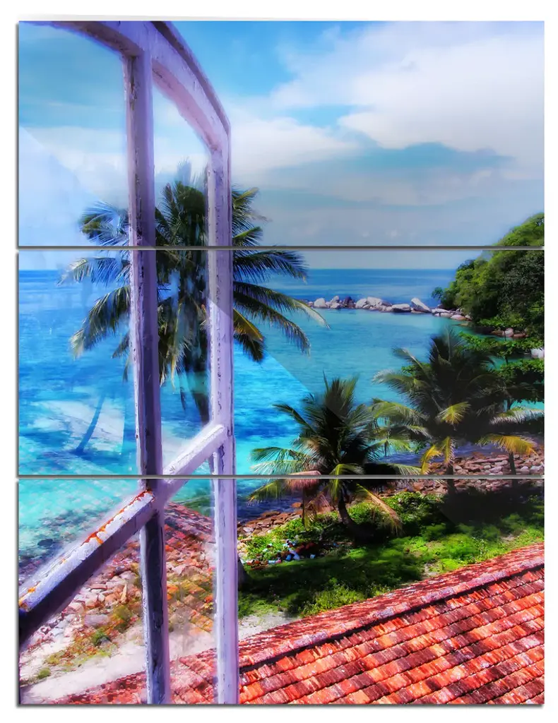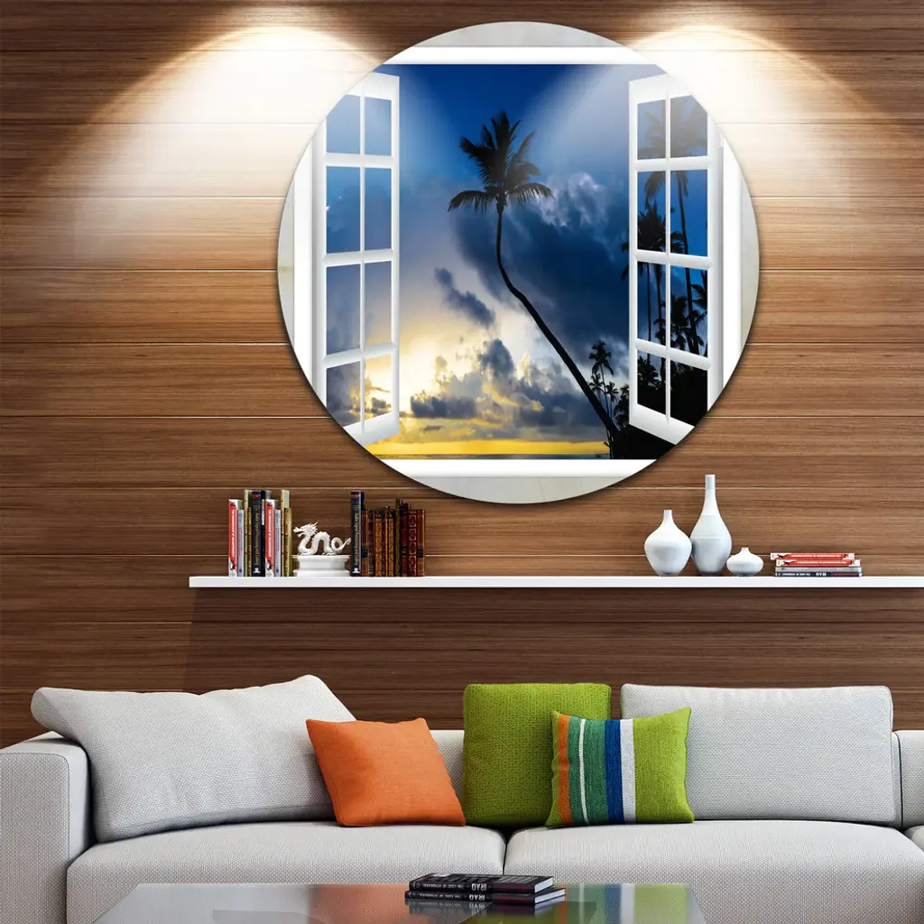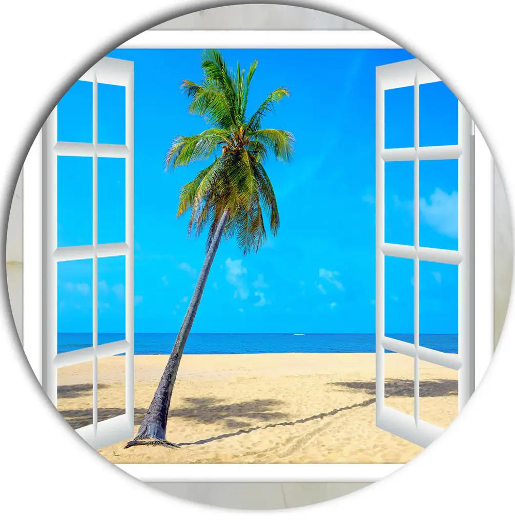 Window To Beach With Coconut Palms, Landscape Disc Metal Wall Art, 36"