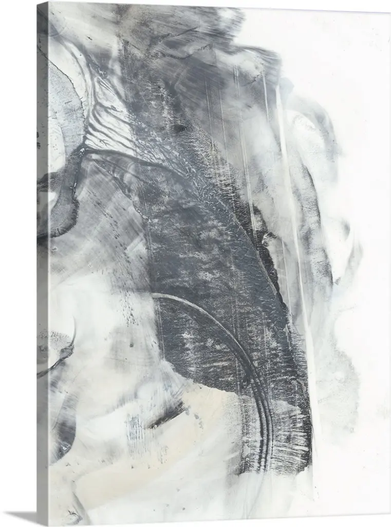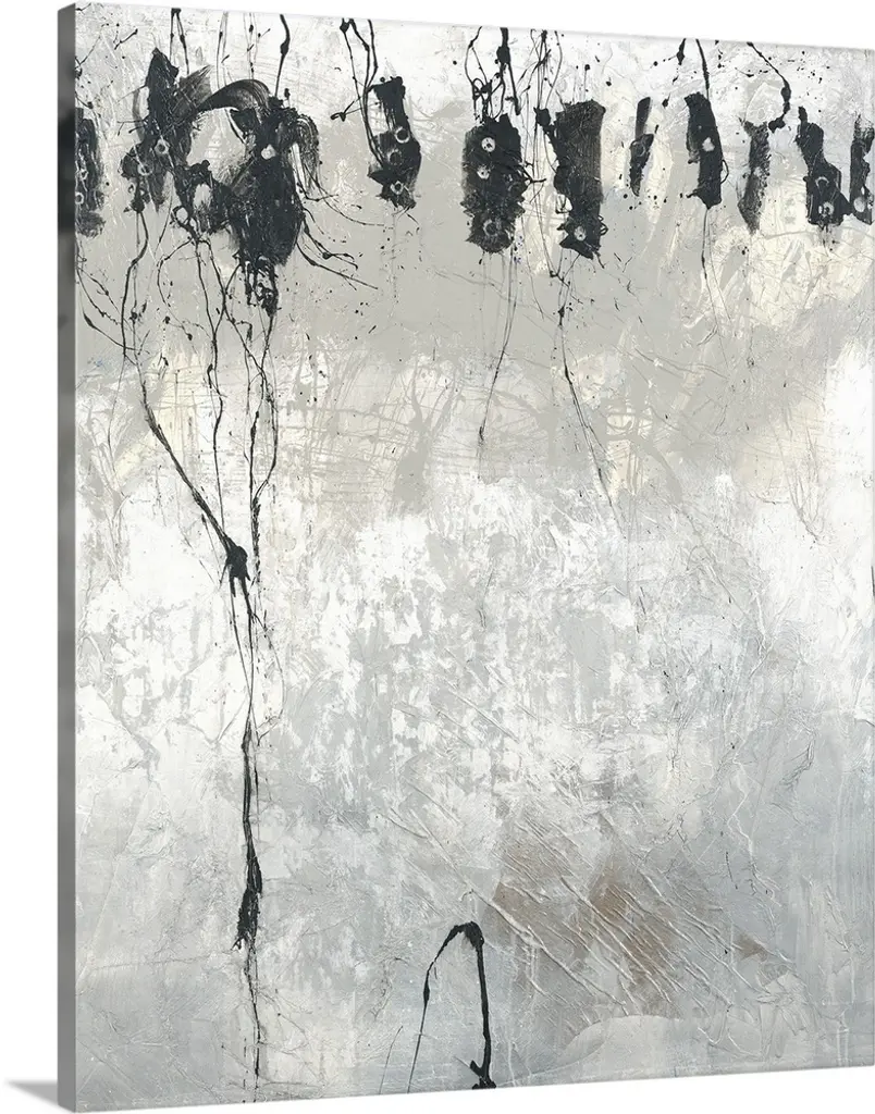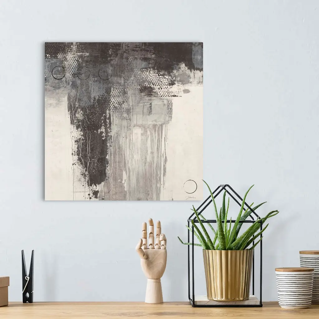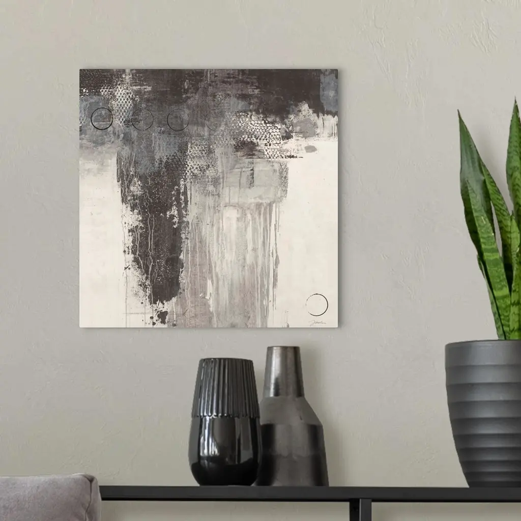 A square abstract painting in varies tones of gray with thin black circles overlaying.