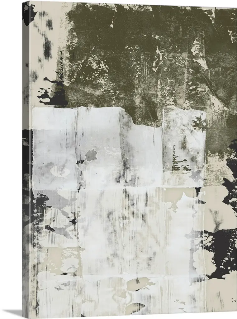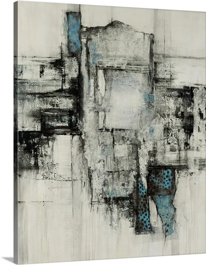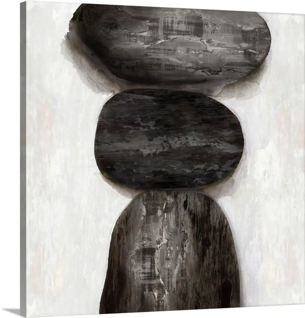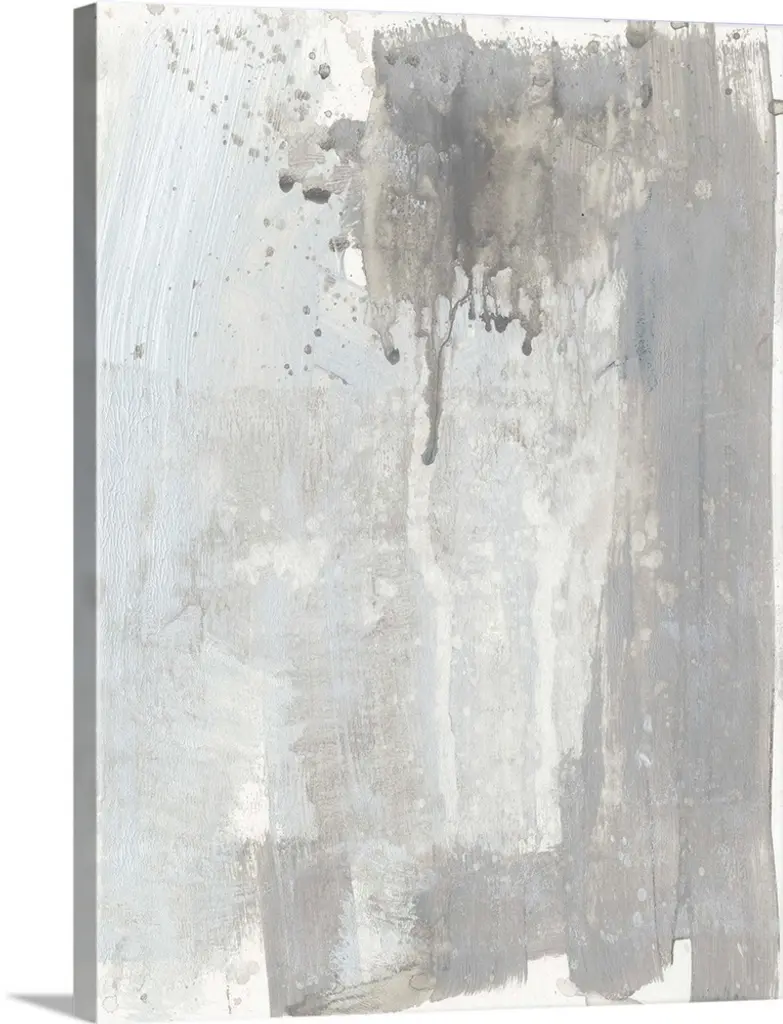 A square abstract painting in varies tones of gray with thin black circles overlaying.