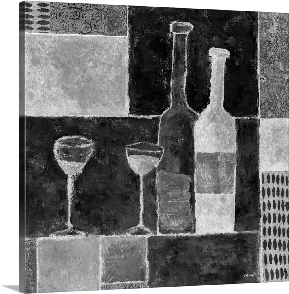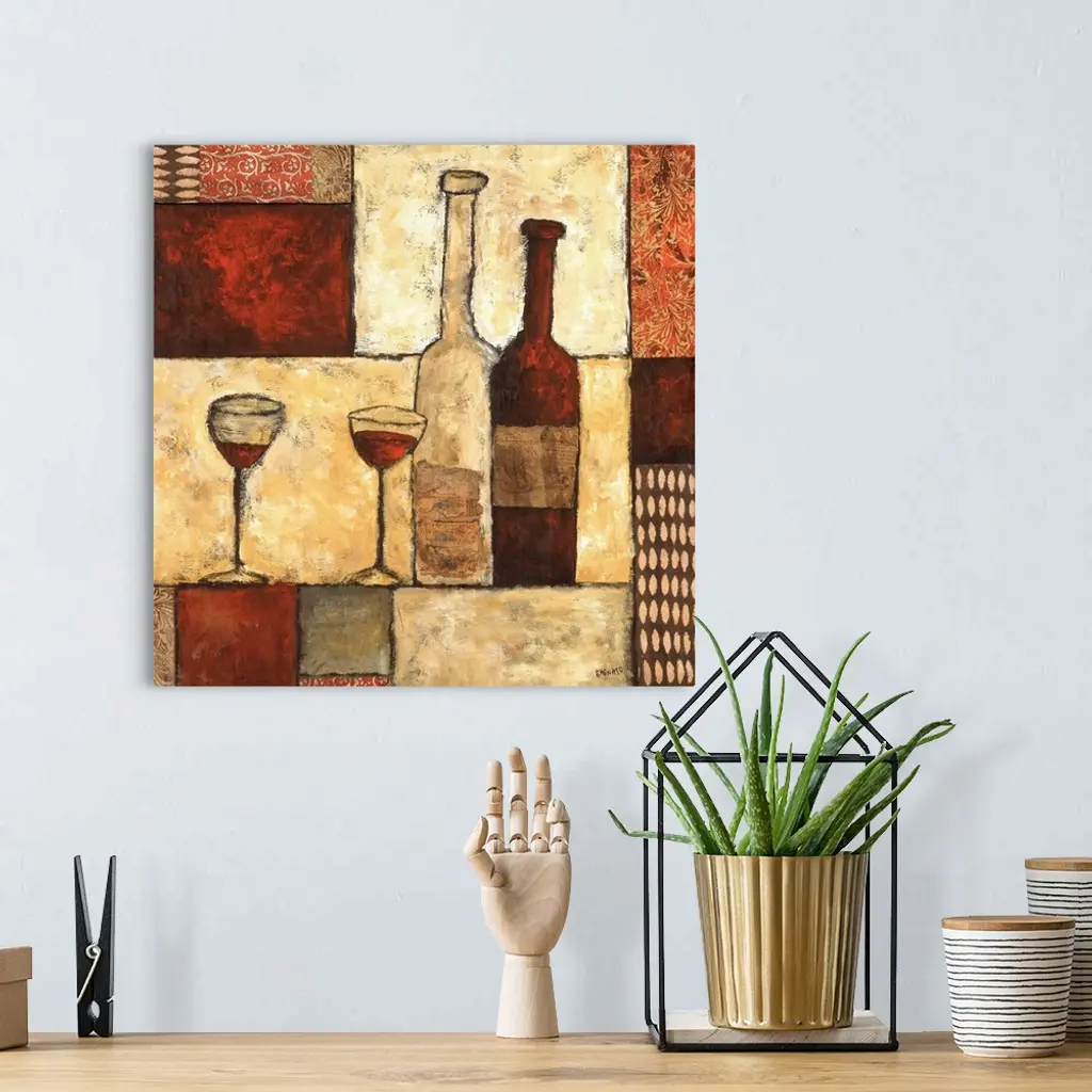 Contemporary artwork of two bottles of wine with a geometric block pattern background.