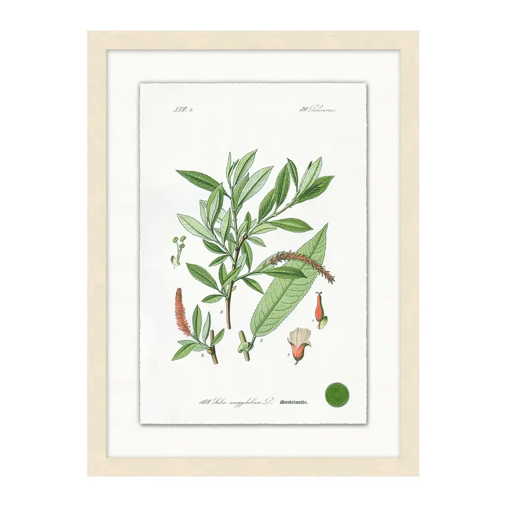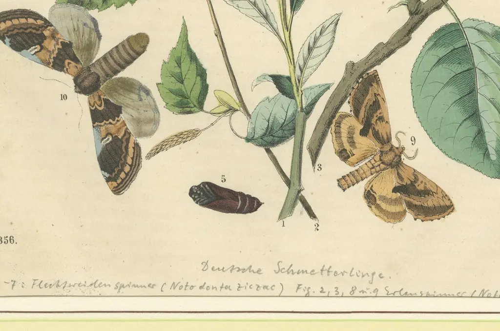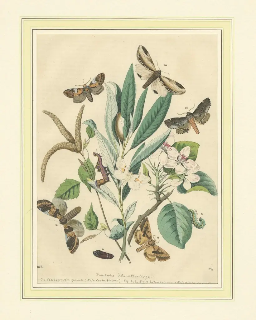 Wings of the Night: Hand-Colored 1856 Lithograph of Exotic Moths and Their Life Cycle Description: This stunning hand-colored lithograph from 1856 is a fine example of 19th-century entomological illustration, capturing the intricate beauty of moths in their natural environment. Likely originating from a natural history publication, this scientifically accurate yet artistically refined print presents various moth species, their larvae, and pupae, carefully arranged around a flowering botanical specimen. The composition is an exquisite blend of scientific observation and aesthetic appeal, with each moth depicted in a different stage of development—caterpillars crawling along leaves, pupae resting on stems, and fully developed moths spreading their delicately patterned wings. The botanical elements are rendered in soft yet precise detail, providing a rich backdrop that enhances the visual depth of the artwork. The meticulous hand-coloring gives life to the scene, showcasing the moths' earthy browns, creams, and subtle iridescent tones. Moth Descriptions: - The largest moth, positioned near the upper right, features striking cream and brown coloration with long, delicate wings, suggestive of the silk moth family. - Another prominent moth, located centrally, is dark brown with orange markings, possibly from the hawk moth (Sphingidae) family, known for their strong, rapid flight. - The smaller moths, scattered throughout the composition, display a variety of earthy tones, intricate patterns, and distinctive wing shapes, reflecting the diversity of nocturnal Lepidoptera. - The presence of caterpillars and pupae adds an educational dimension, illustrating the moth’s complete metamorphosis. Attribution and Date: Published in 1856, this lithograph is part of a series dedicated to entomology, likely produced by a German naturalist or scientific illustrator. Lithography was a preferred medium during this period, allowing for fine detail and delicate hand-coloring that elevated these works beyond mere scientific records into true works of art. Condition Summary: This antique print is in good condition for its age, with only minor age toning and faint foxing along the margins. The hand-coloring remains vivid, and the paper has been well-preserved. A double-bordered mat enhances the overall presentation, making it ready for display. Framing Tips: - Use UV-protective glass to prevent fading and preserve the hand-coloring. - A classic wooden frame in dark brown or gold will complement the earthy tones of the moths and botanical details. - Acid-free matting is recommended to prevent discoloration and maintain the integrity of the paper. - A floating mount can be used to showcase the print’s edges, emphasizing its antique character. This rare and beautifully executed lithograph is a valuable addition for collectors of entomology prints, natural history enthusiasts, or those who appreciate the elegance of 19th-century scientific illustrations.