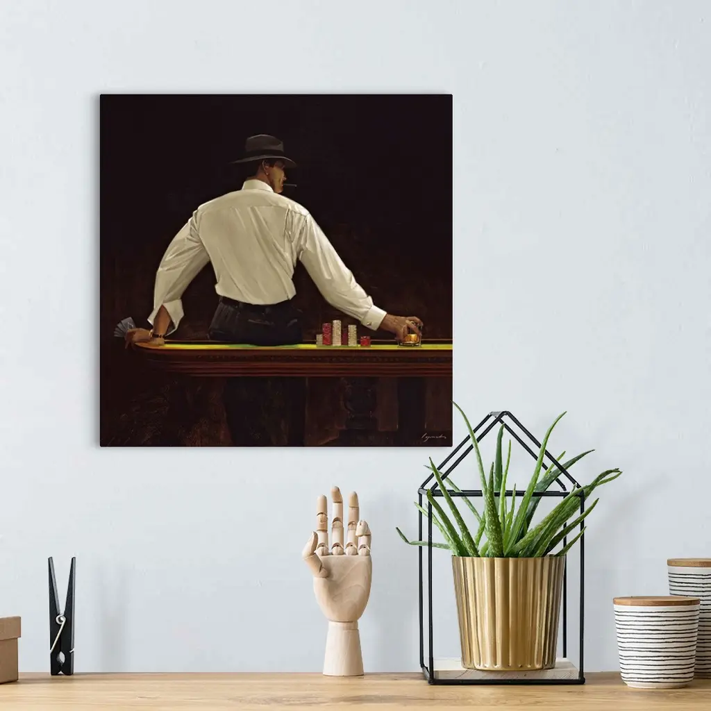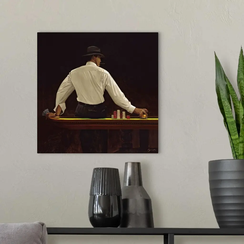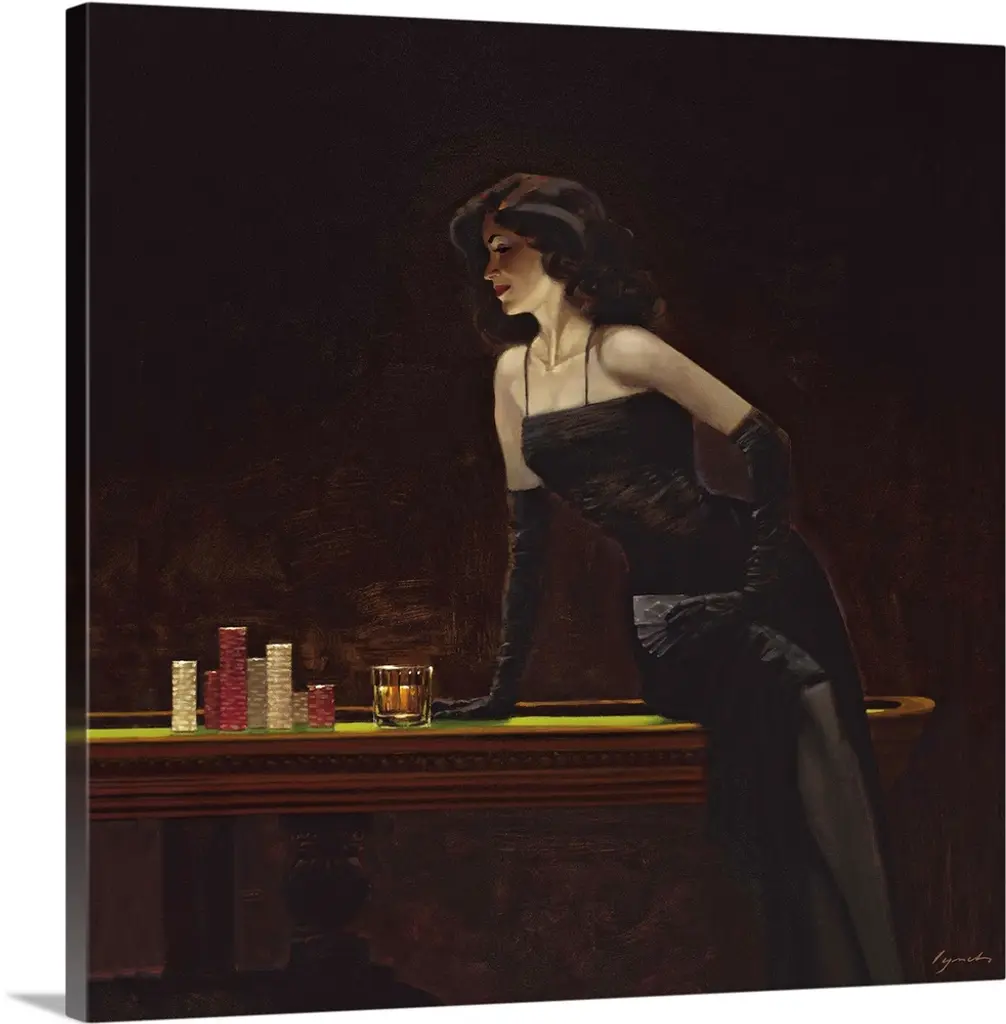 Contemporary painting of man sitting on the edge of a casino table, holding playing cards in one hand and moving chips with the other.