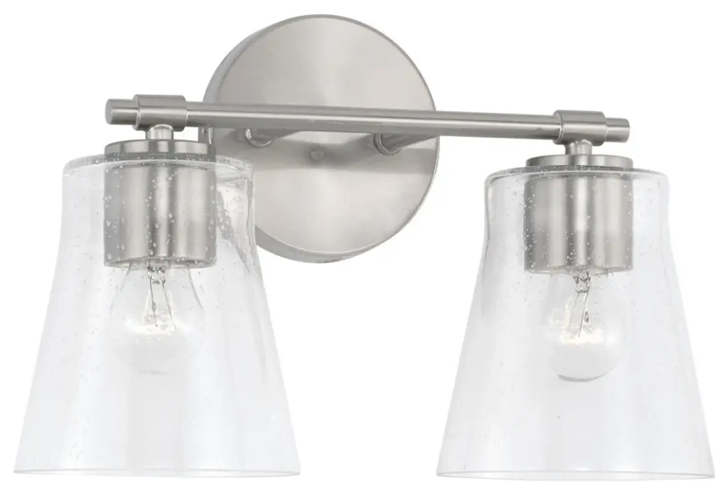 Tidy up in front of the mirror with the comfortable glow and charmingly detailed design of the Winsley Vanity Light from Minka-Lavery. It's a transitional piece with thoughtfully composed shapes. The circular backplate mounts the piece to the wall with minimal space required. Clear-seeded glass shades hang in front, softening the lamp's light with fine texture.