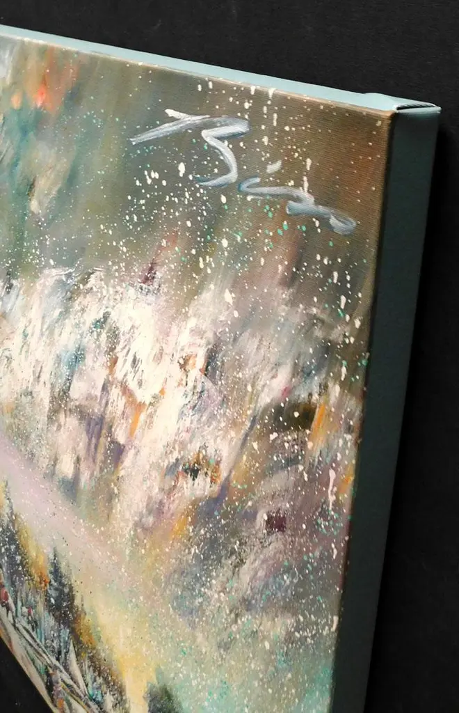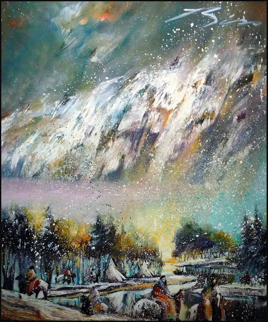 "Winter Camp at the Headwater" #12 Posthumous reproduction Commemorative Limited Edition Giclee on Canvas by Earl Biss Art size : 20" x 25" Edition Size: 100 Condition: Mint Earl Biss 1947-1998 Artist Earl Biss was a member of the Crow Nation. He had a fine classical education in the arts; graduating from the Institute of American Indian Arts in Santa Fe, New Mexico, followed by several years of study at the San Francisco Art Institute, Biss continued with a year of independent study in Europe. Earl Biss's works are alive in imagination, with flowing, textured strokes of color and form conveying the moods wonder in the dreams and hopes of an exciting people who are his own, the Crow Indian. A member of the Crow Nation, Earl Biss was one of the most prominent American Indian artists. His paintings are hanging in museums around the world.