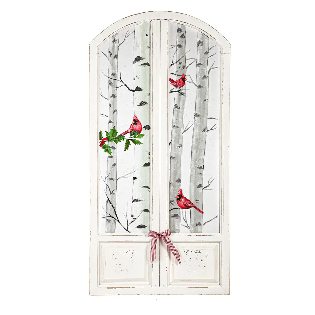 This hand painted wooden Winter Cardinal Arched Window Wall Decor peers out onto a frosted birch tree forest. Detailed cardinals and holly provide a beautifully festive pop of color. The lovely arched window's distressed finish gives it a weathered appearance that contributes to its rustic appeal and makes it a warm complement to any seasonal style. The hand-painted elements give your area dimension and color. Simply display on a mantel or bookshelf, or hang on the wall by the anchor along the back.