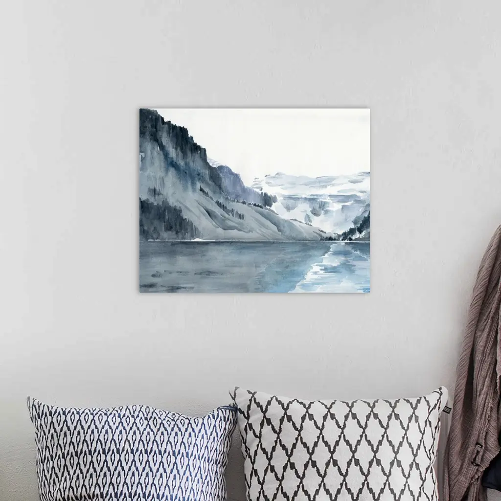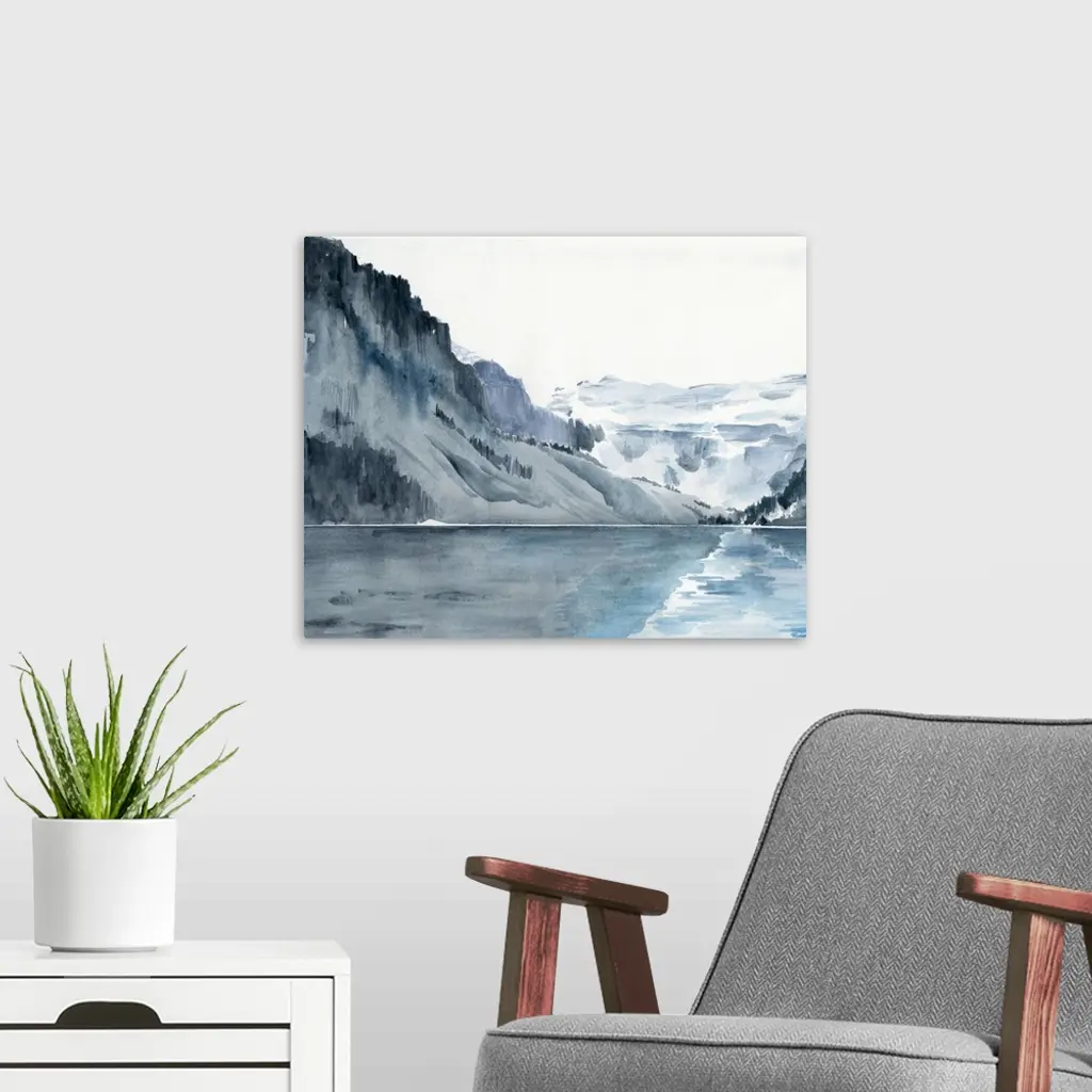 Watercolor painting of the beautiful Norwegian Fjords, with the mountains reflecting in the water.