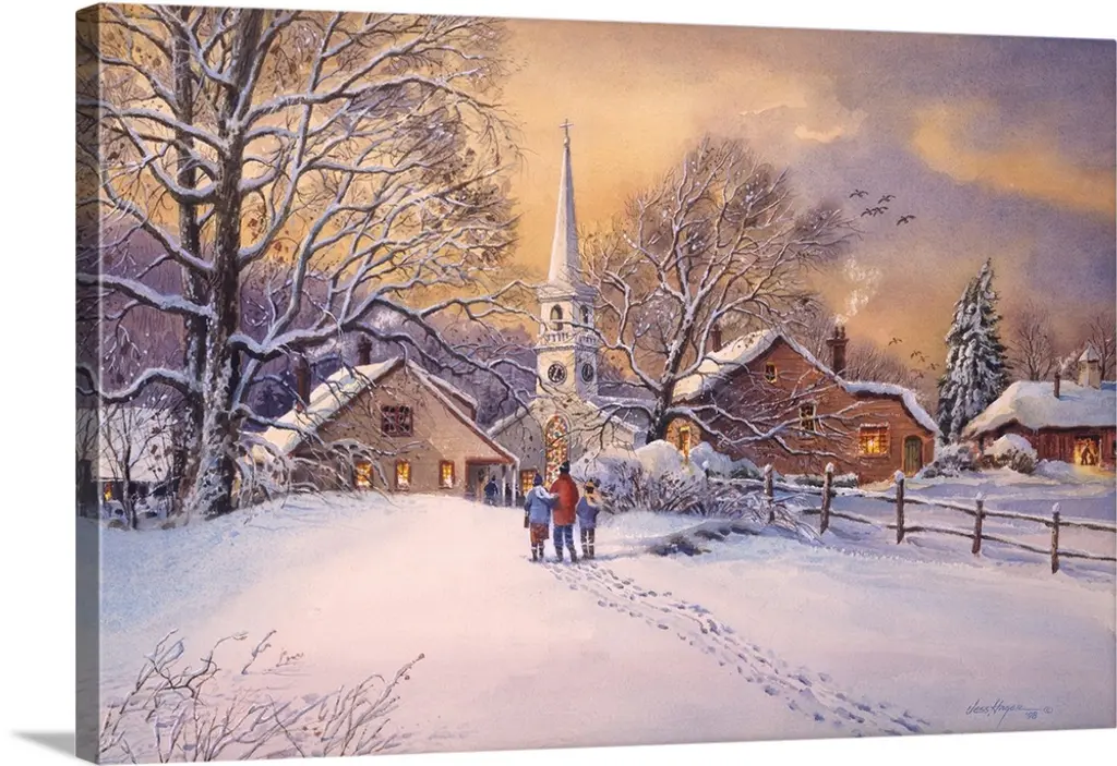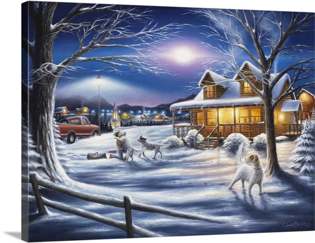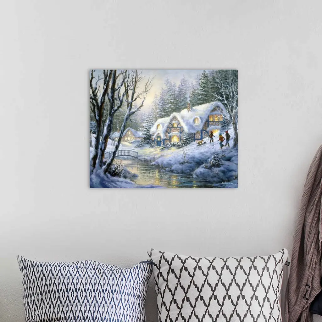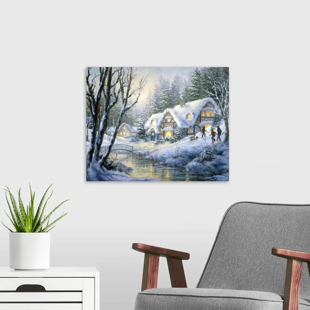 Painting of village scene featuring a house with glowing windows. Product is a painting reproduction only, and does not contain actual lights.
