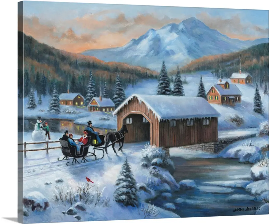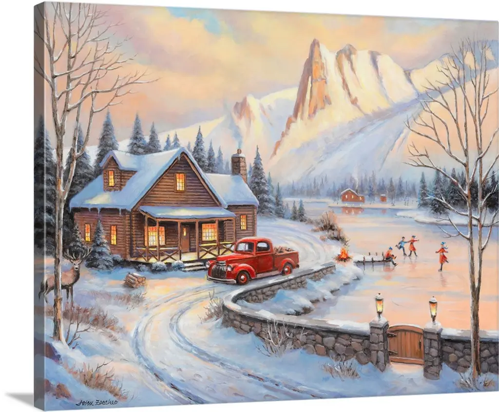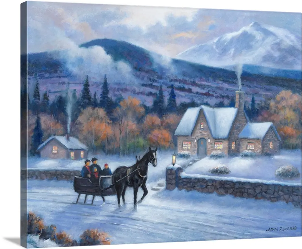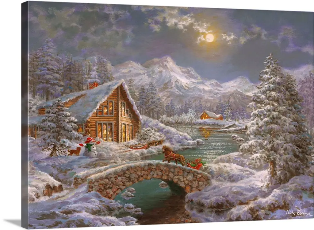 Painting of village scene featuring a house with glowing windows. Product is a painting reproduction only, and does not contain actual lights.