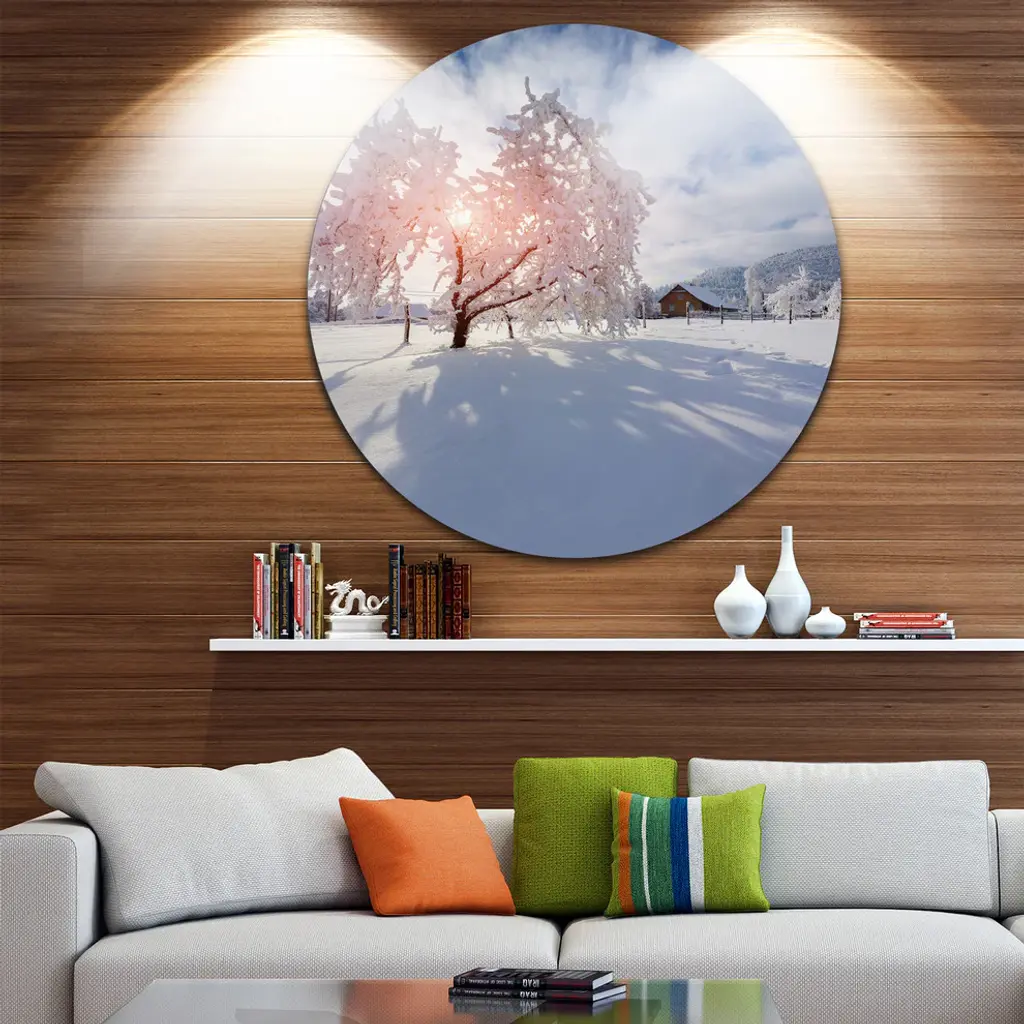 Bring Contemporary Abstraction to your home with this large Circle Metal wall art. This Winter in Carpathian Village Metal Artwork makes it the focal point of any room or office. - White Gloss Coating ensures colors are extra vibrant with light reflection.- Aluminum grade Sheet Metal with 1 inch mounting frame on the back giving the illusion that the artwork is floating on the wall..- Mounting Brackets are included along with instructions.- High Quality Digital images are created directly into a glossy aluminum panel producing a stunning and captivating print into the glossy finish of the metal.- Water, Fire and Scratch resistant HD Aluminum panels.- Looks better than any photo paper and guaranteed to last at least 20 years- Easy to clean with a microfiber cloth. Colors are far superior to regular Canvas Art. - Easy to Hang