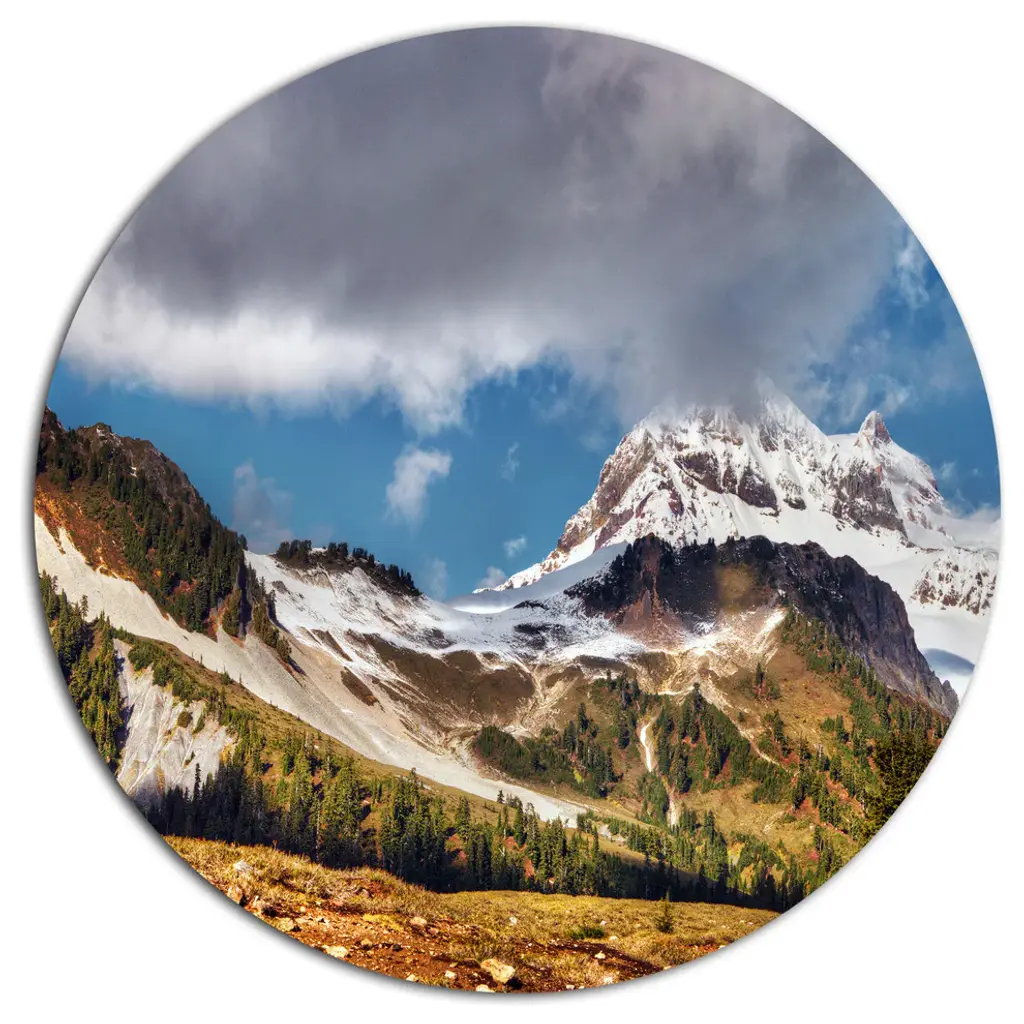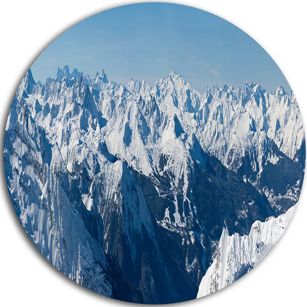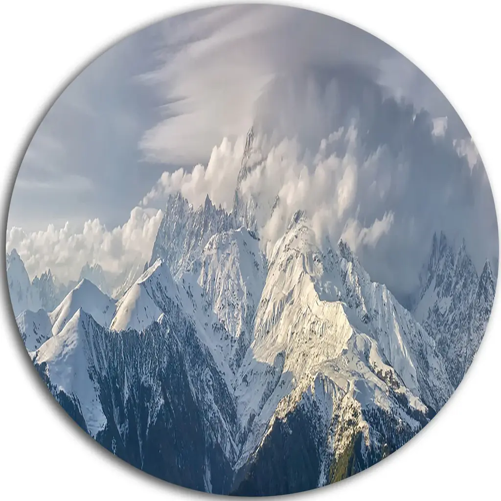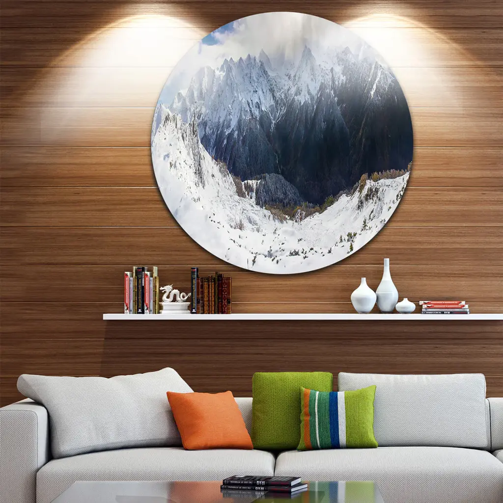 Bring Contemporary Abstraction to your home with this large Circle Metal wall art. This Winter Mountain in Svaneti Metal Artwork makes it the focal point of any room or office. - White Gloss Coating ensures colors are extra vibrant with light reflection.- Aluminum grade Sheet Metal with 1 inch mounting frame on the back giving the illusion that the artwork is floating on the wall..- Mounting Brackets are included along with instructions.- High Quality Digital images are created directly into a glossy aluminum panel producing a stunning and captivating print into the glossy finish of the metal.- Water, Fire and Scratch resistant HD Aluminum panels.- Looks better than any photo paper and guaranteed to last at least 20 years- Easy to clean with a microfiber cloth. Colors are far superior to regular Canvas Art. - Easy to Hang