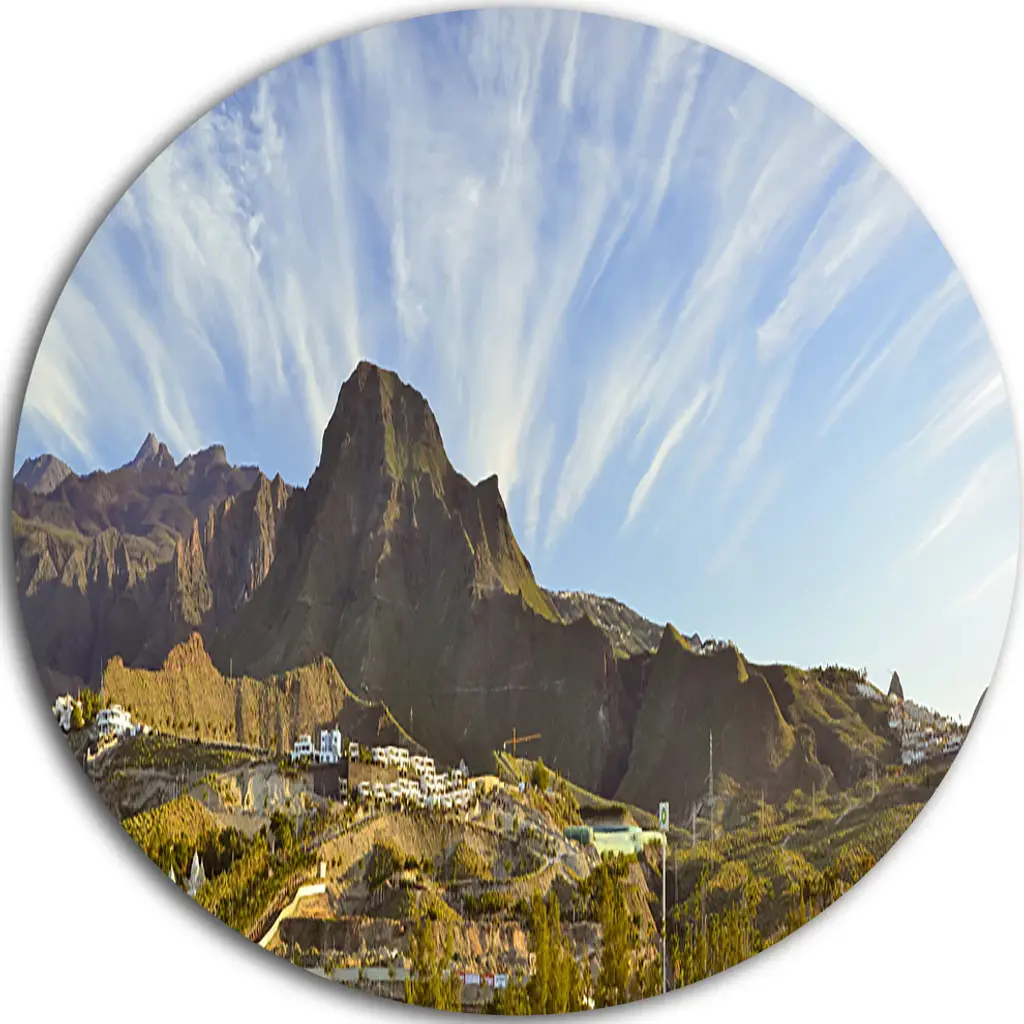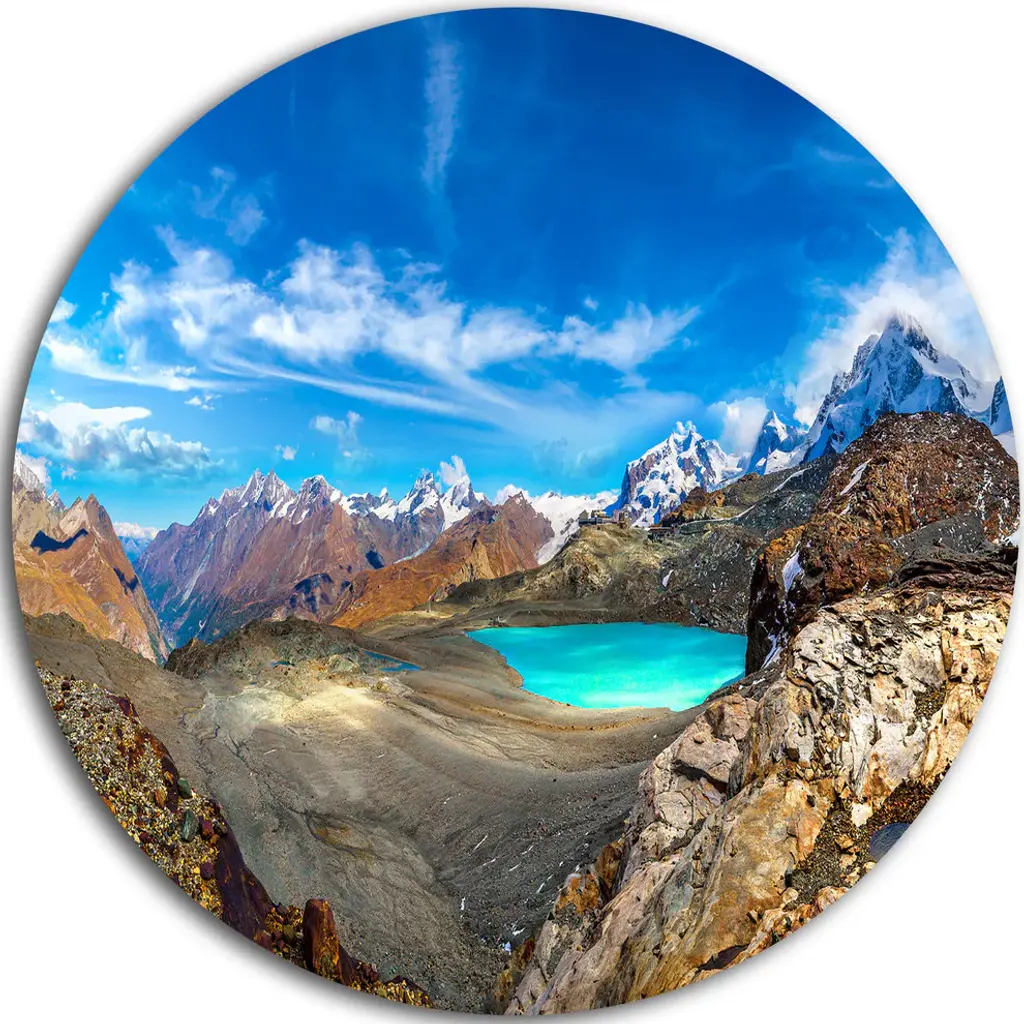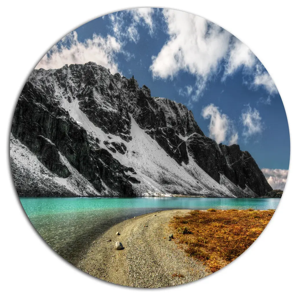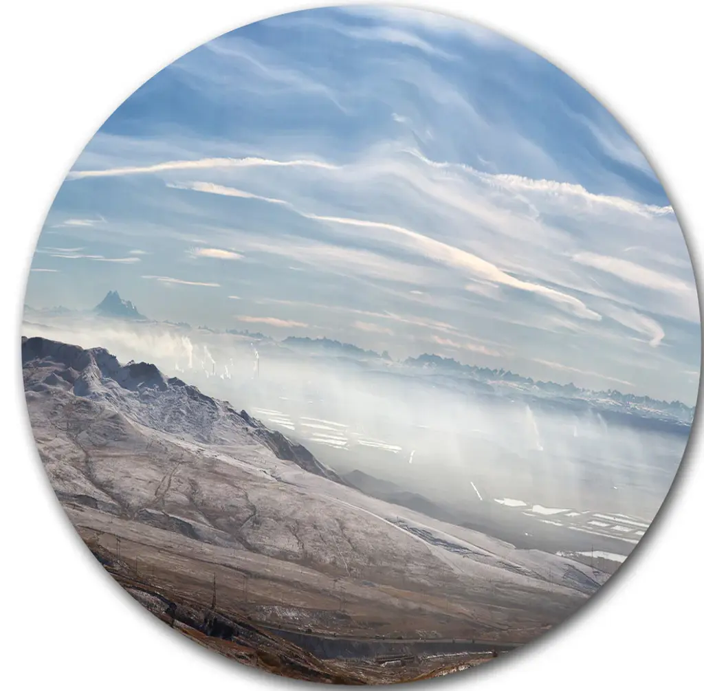 Bring Contemporary Abstraction to your home with this large Circle Metal wall art. This Winter Mountains in Caucasus Metal Artwork makes it the focal point of any room or office. - White Gloss Coating ensures colors are extra vibrant with light reflection.- Aluminum grade Sheet Metal with 1 inch mounting frame on the back giving the illusion that the artwork is floating on the wall..- Mounting Brackets are included along with instructions.- High Quality Digital images are created directly into a glossy aluminum panel producing a stunning and captivating print into the glossy finish of the metal.- Water, Fire and Scratch resistant HD Aluminum panels.- Looks better than any photo paper and guaranteed to last at least 20 years- Easy to clean with a microfiber cloth. Colors are far superior to regular Canvas Art. - Easy to Hang