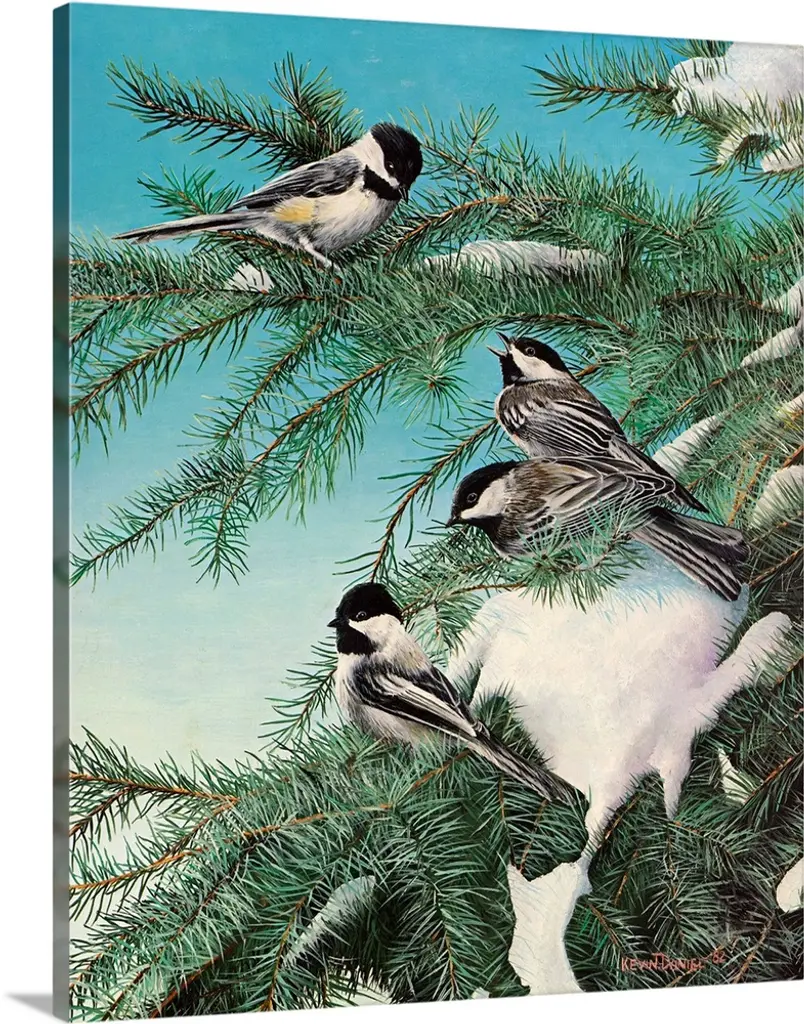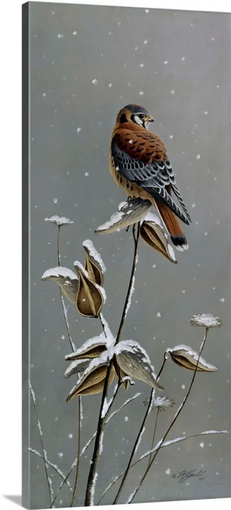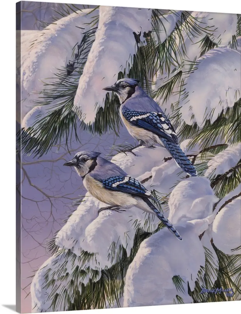 Contemporary painting of quails resting in a snowy patch of grass in winter.