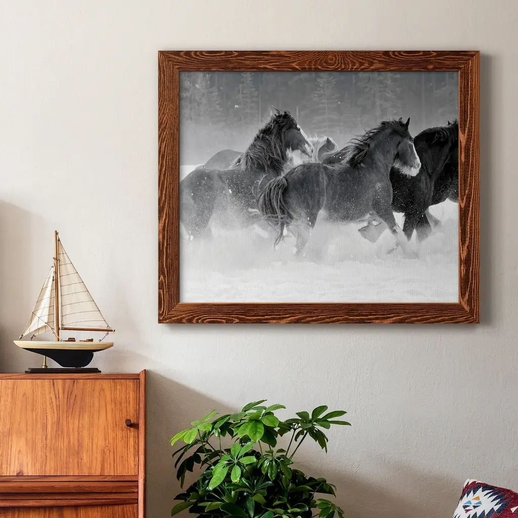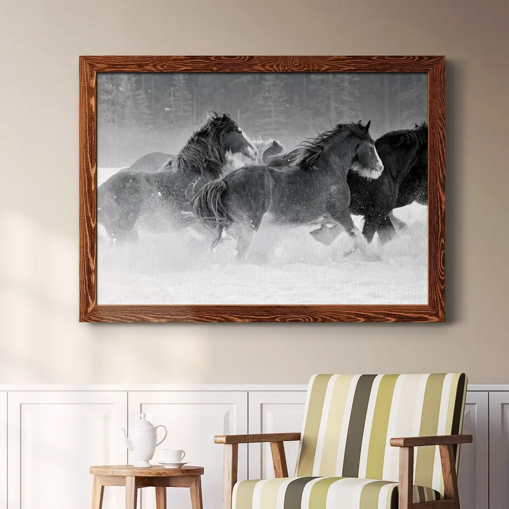 Winter Roundup I-Premium Framed Canvas - Ready to Hang Framed in distressed wood and available in an array of sizes and colors Each piece is joined and assembled by hand and comes ready to hang FRAMED CANVAS GICLEE READY TO HANG MADE IN THE USA SOLID WOOD FRAME MADE IN USA FADE RESISTANT GICLEE PRINTING on Canvas