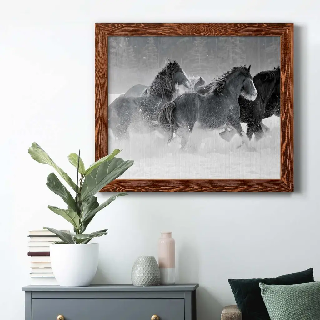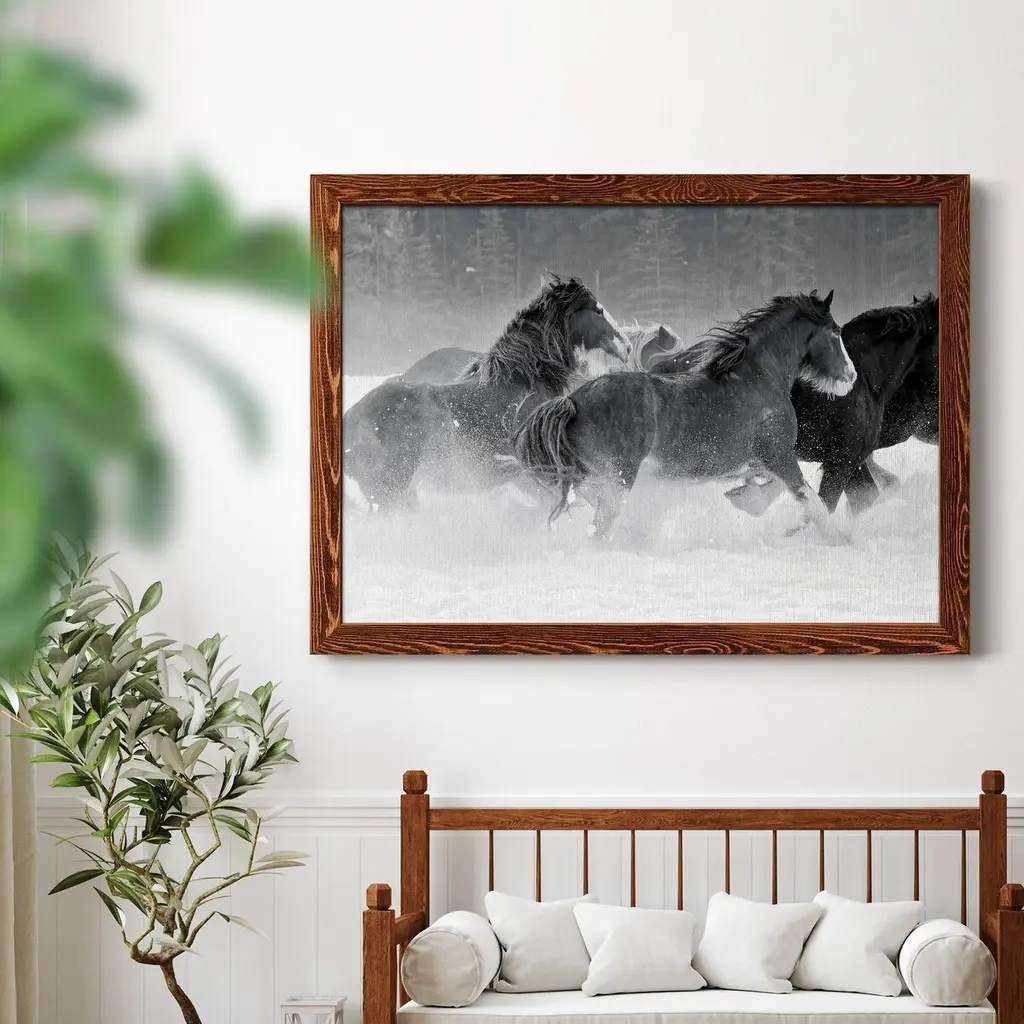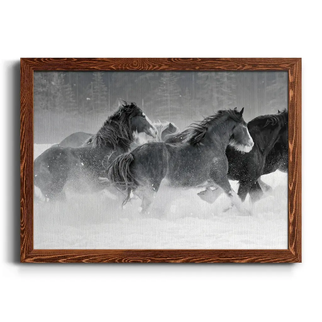 Winter Roundup I-Premium Framed Canvas - Ready to Hang Framed in distressed wood and available in an array of sizes and colors Each piece is joined and assembled by hand and comes ready to hang FRAMED CANVAS GICLEE READY TO HANG MADE IN THE USA SOLID WOOD FRAME MADE IN USA FADE RESISTANT GICLEE PRINTING on Canvas