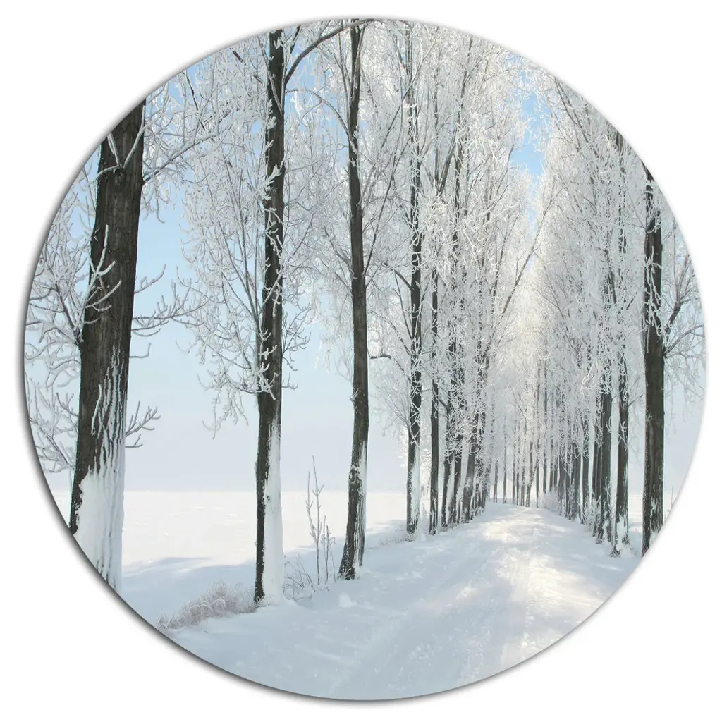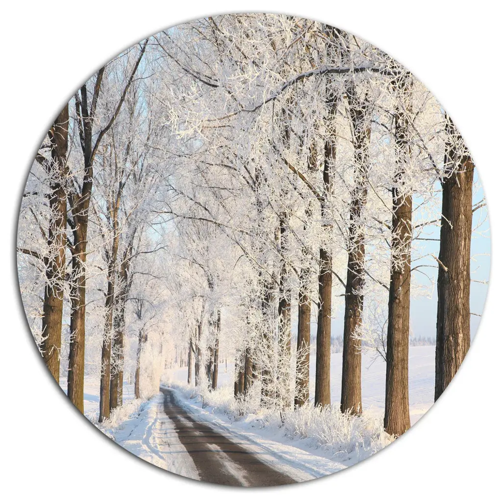 Bring Contemporary Abstraction to your home with this large Circle Metal wall art. This Winter Rural Road in the Morning Metal Artwork makes it the focal point of any room or office. - White Gloss Coating ensures colors are extra vibrant with light reflection.- Aluminum grade Sheet Metal with 1 inch mounting frame on the back giving the illusion that the artwork is floating on the wall..- Mounting Brackets are included along with instructions.- High Quality Digital images are created directly into a glossy aluminum panel producing a stunning and captivating print into the glossy finish of the metal.- Water, Fire and Scratch resistant HD Aluminum panels.- Looks better than any photo paper and guaranteed to last at least 20 years- Easy to clean with a microfiber cloth. Colors are far superior to regular Canvas Art. - Easy to Hang