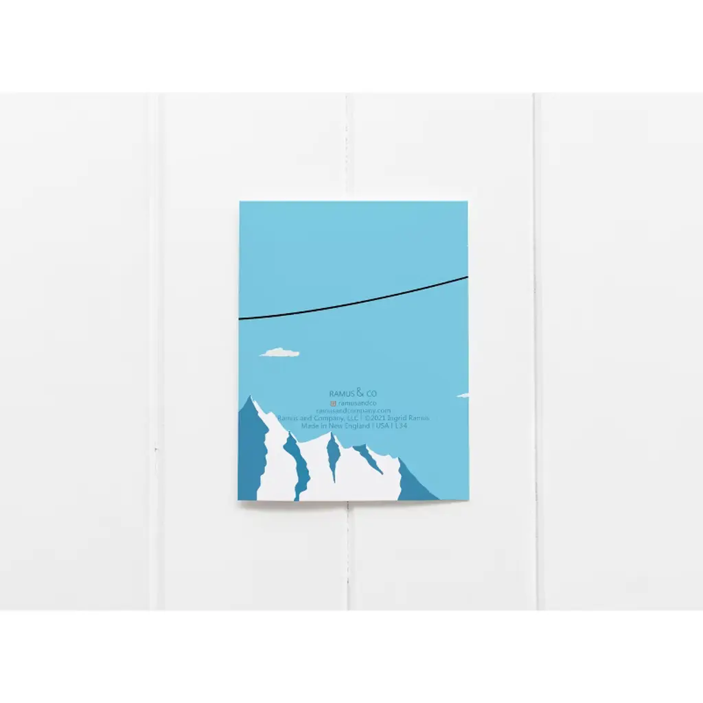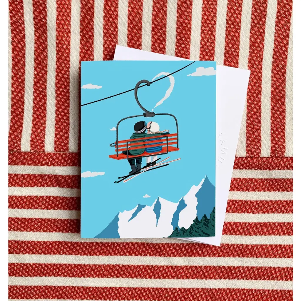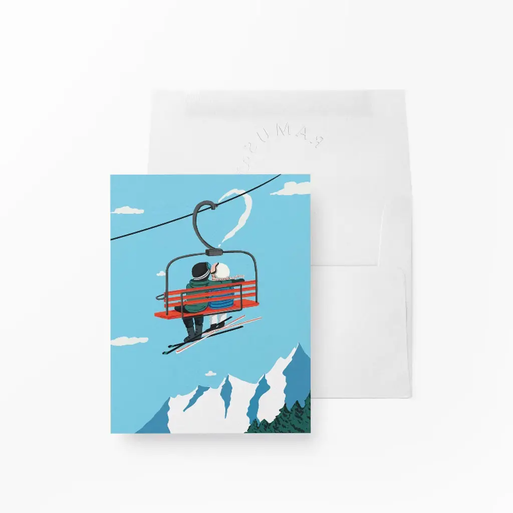 This 8-pack of greeting cards is elegantly illustrated by artist Ingrid Ramus, founder and owner of the Ramus & Co brand. Artwork features two skiers on a chair lift under a heart.. All greeting cards are made in the USA on heavyweight uncoated and locally-sourced and manufactured card stock. Each card is accompanied by a hand-embossed envelope made with heavyweight 95lb paper and a peel-and-stick flap - no licking envelopes here! All Ramus & Co. greeting cards are printed on FSC and SFI certified paper sourced from a regional mill that harnesses 66% of its energy from on-site sustainable sources, such as emission-free hydroelectricity and biomass co-generation from wood waste. All 8 greeting cards come packaged as a boxed set. Husband-and-wife team Calvin and Ingrid Ramus founded Ramus & Company in 2019, in New England, USA. Ingrid, the creative designer behind the brand, originates from Mexico, where she cultivated her skills in fashion and textile design. Drawing from her unique and inquisitive perspective on preppy style, Ingrid prolifically designs whimsical yet classic stationery and lifestyle items.