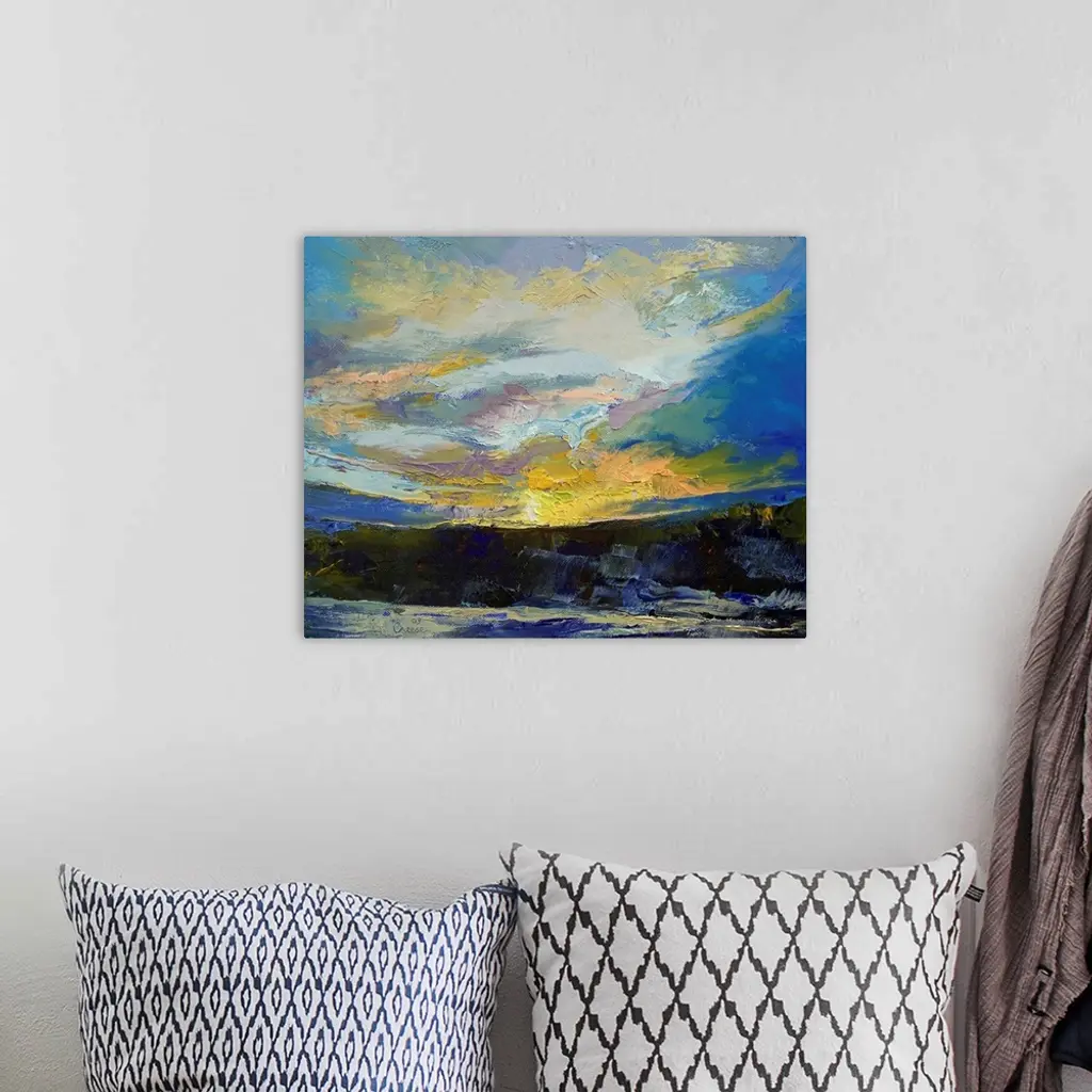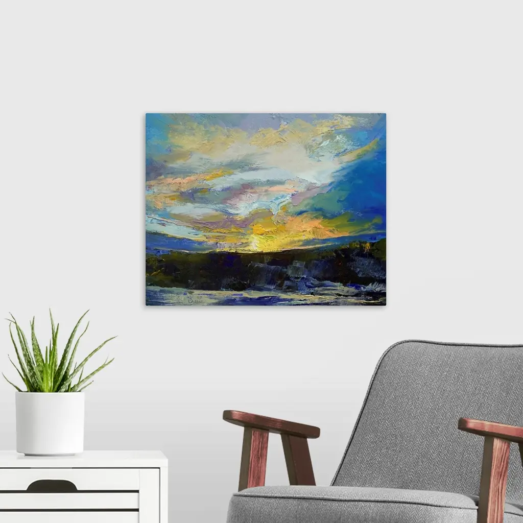 Large, landscape abstract painting of the sun setting in a vibrant sky over a winter landscape. Painting has thick textures due to use of oil paints.