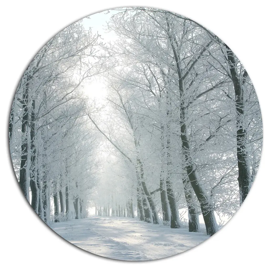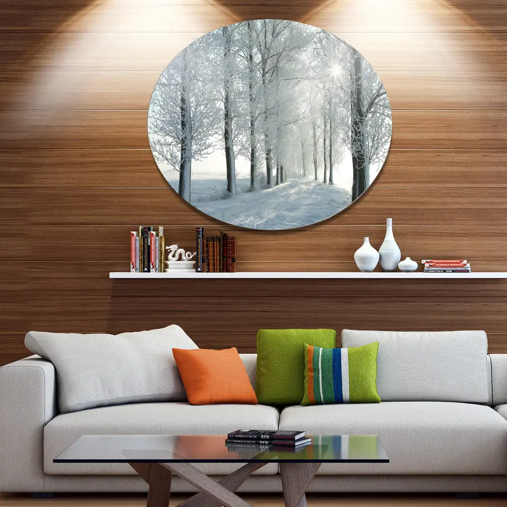 Bring Contemporary Abstraction to your home with this large Circle Metal wall art. This Winter Trees Backlit by Morning Sun Metal Artwork makes it the focal point of any room or office. - White Gloss Coating ensures colors are extra vibrant with light reflection.- Aluminum grade Sheet Metal with 1 inch mounting frame on the back giving the illusion that the artwork is floating on the wall..- Mounting Brackets are included along with instructions.- High Quality Digital images are created directly into a glossy aluminum panel producing a stunning and captivating print into the glossy finish of the metal.- Water, Fire and Scratch resistant HD Aluminum panels.- Looks better than any photo paper and guaranteed to last at least 20 years- Easy to clean with a microfiber cloth. Colors are far superior to regular Canvas Art. - Easy to Hang