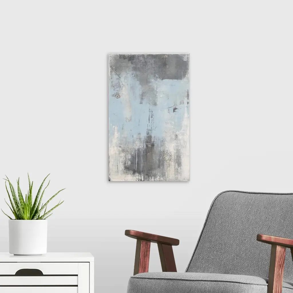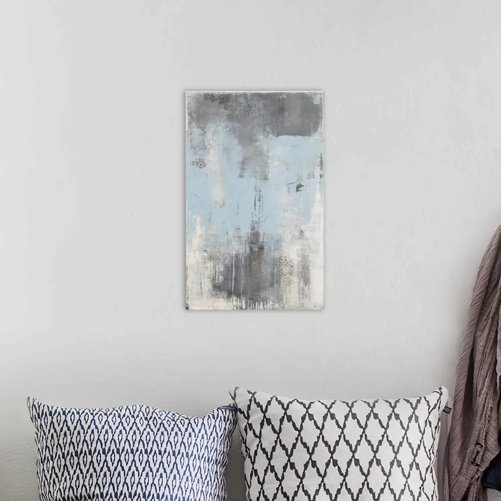 Vertical abstract painting created with shades of gray, white, and light blue.