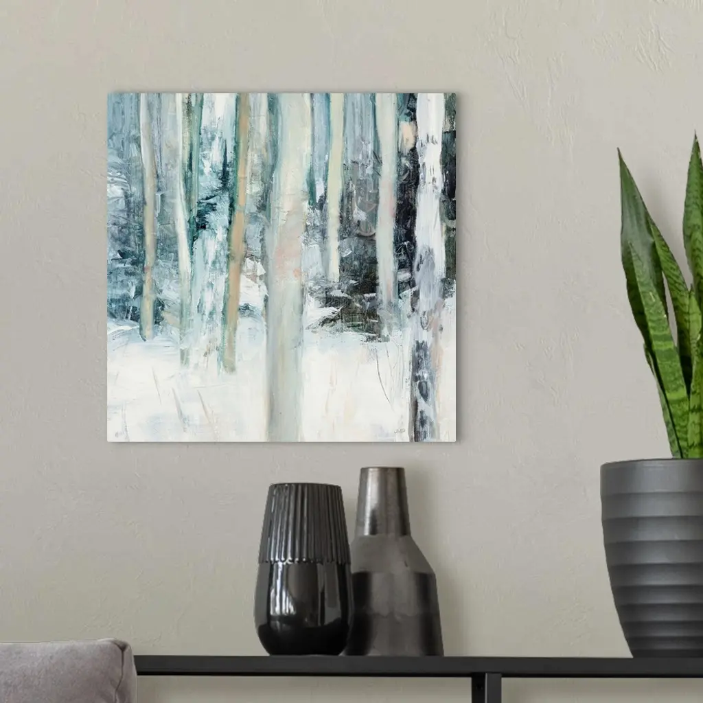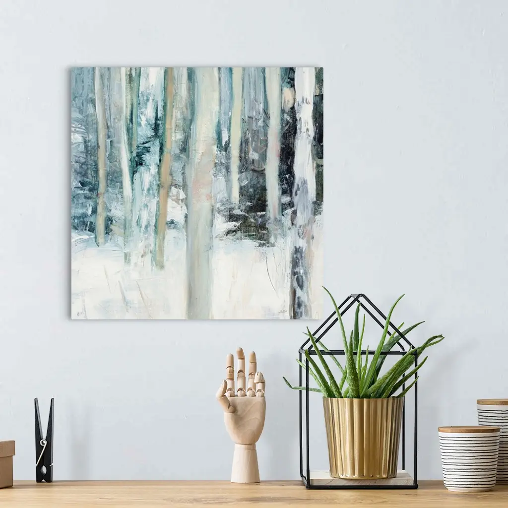 Square abstract painting of birch trees in the woods covered in snow with cool tones.