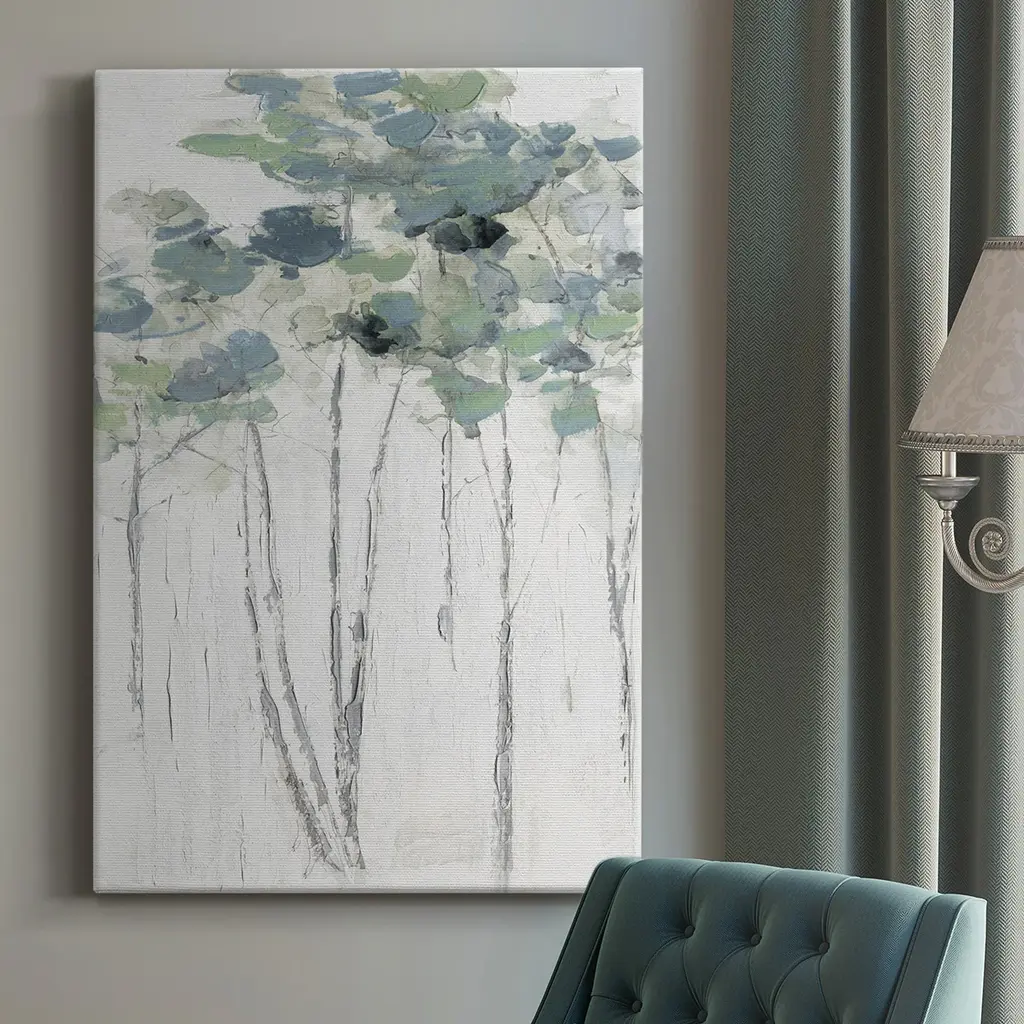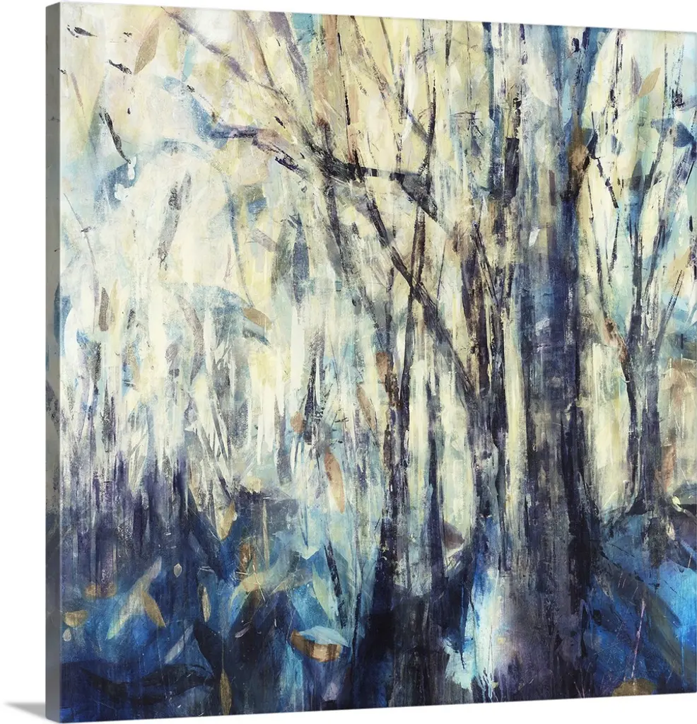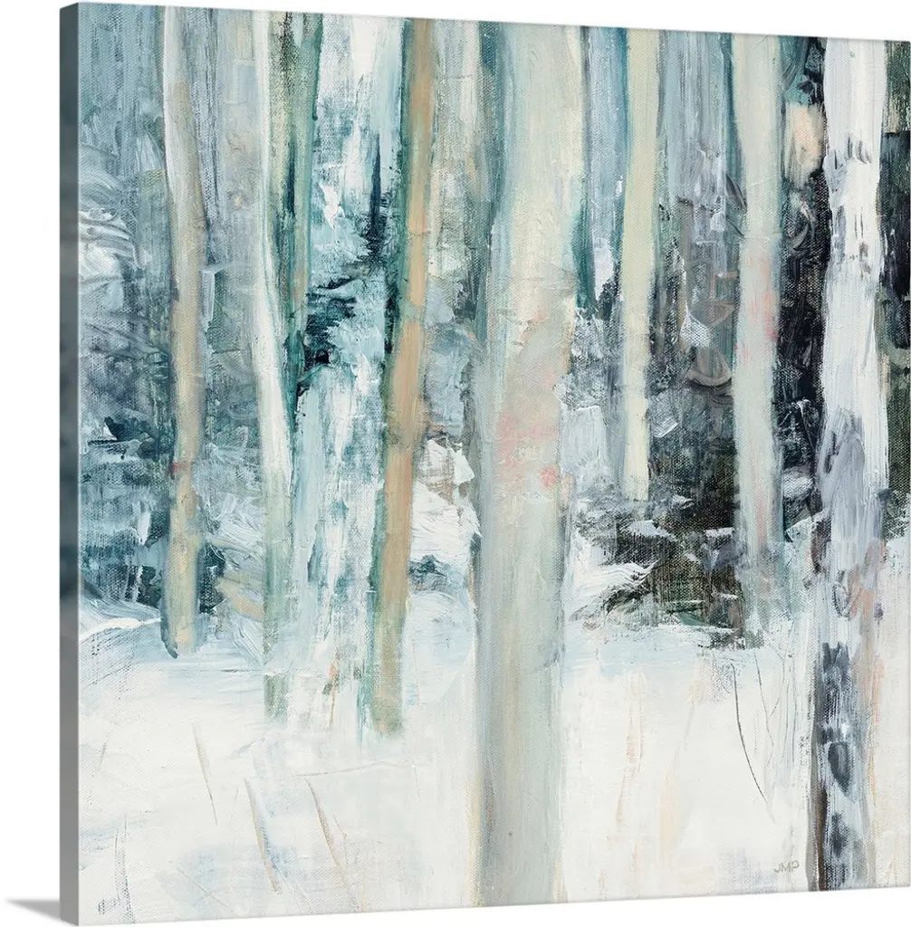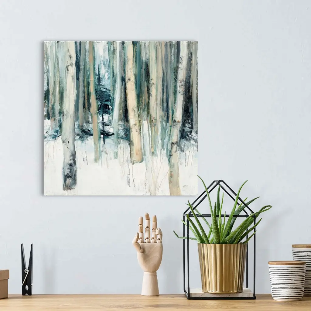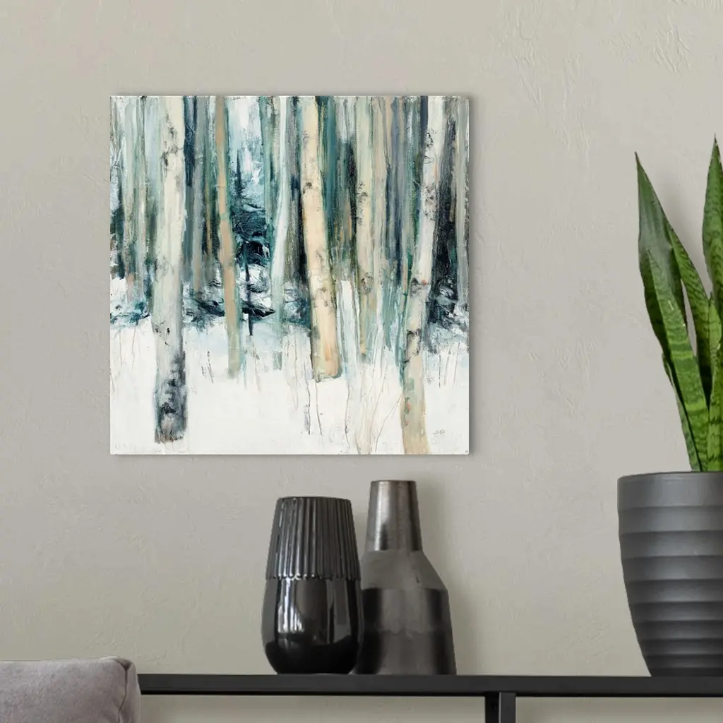 Square abstract painting of birch trees in the woods covered in snow with cool tones.