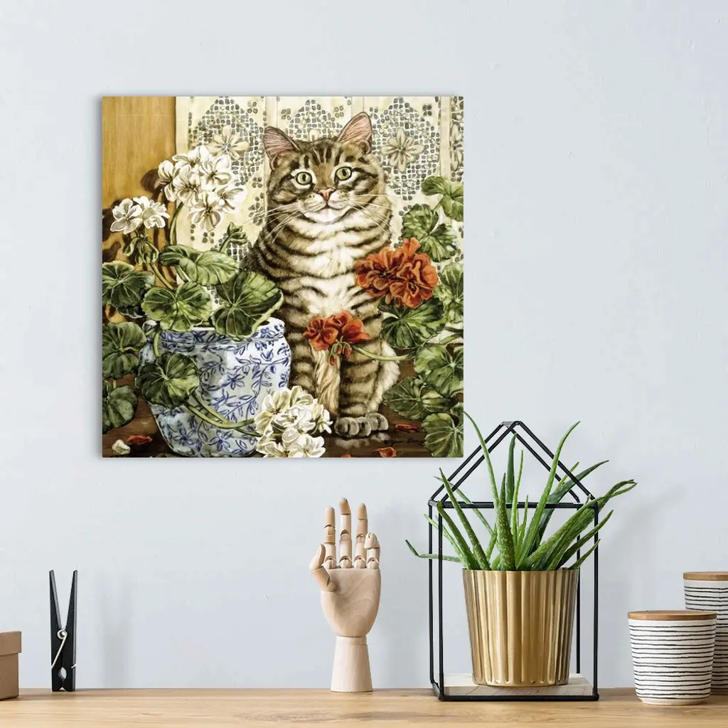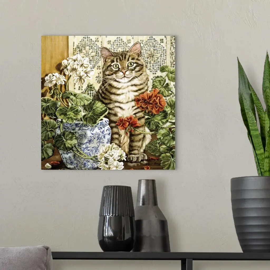 Contemporary painting of a cat sitting, on a table with flowers in vases.