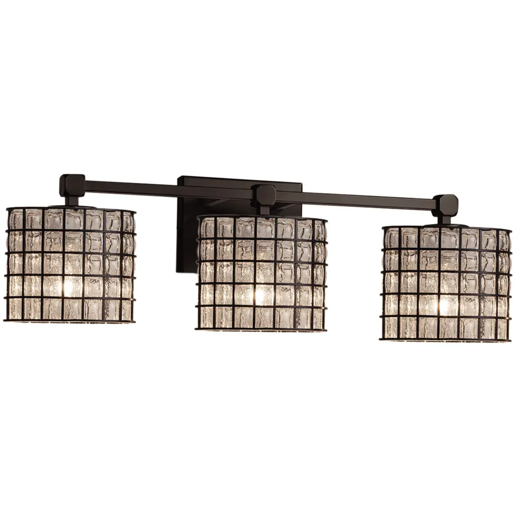 Wire Glass - Tetra 3-Light LED Bath Bar - Cylinder w/ Flat Rim Shade - Grid with Clear Bubbles - Matte Black - Dedicated LED