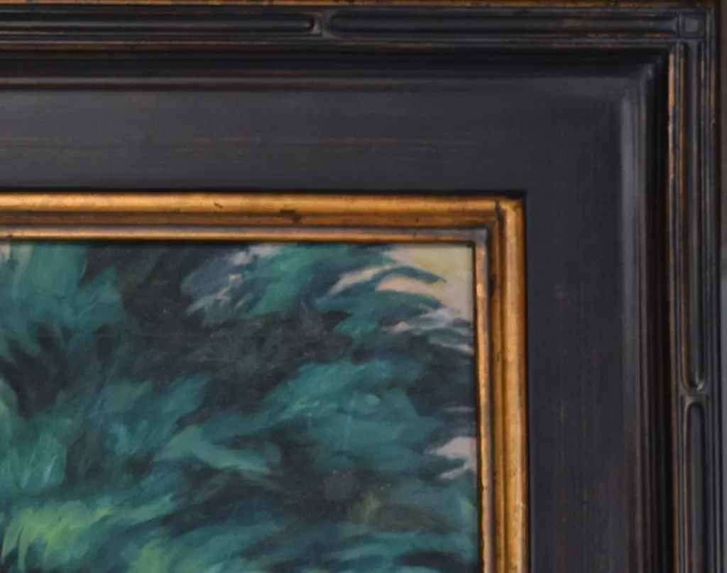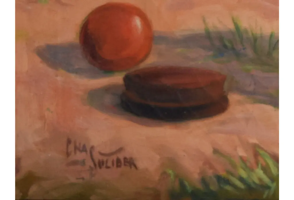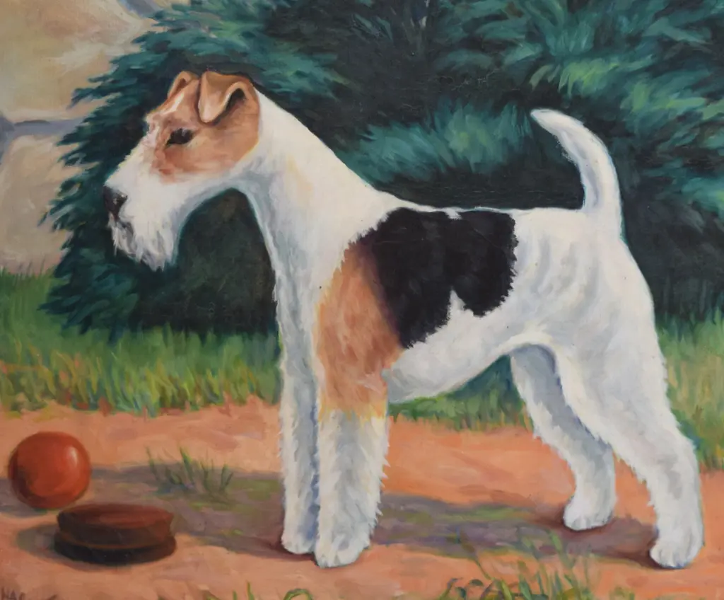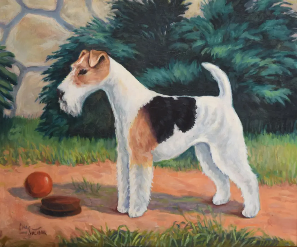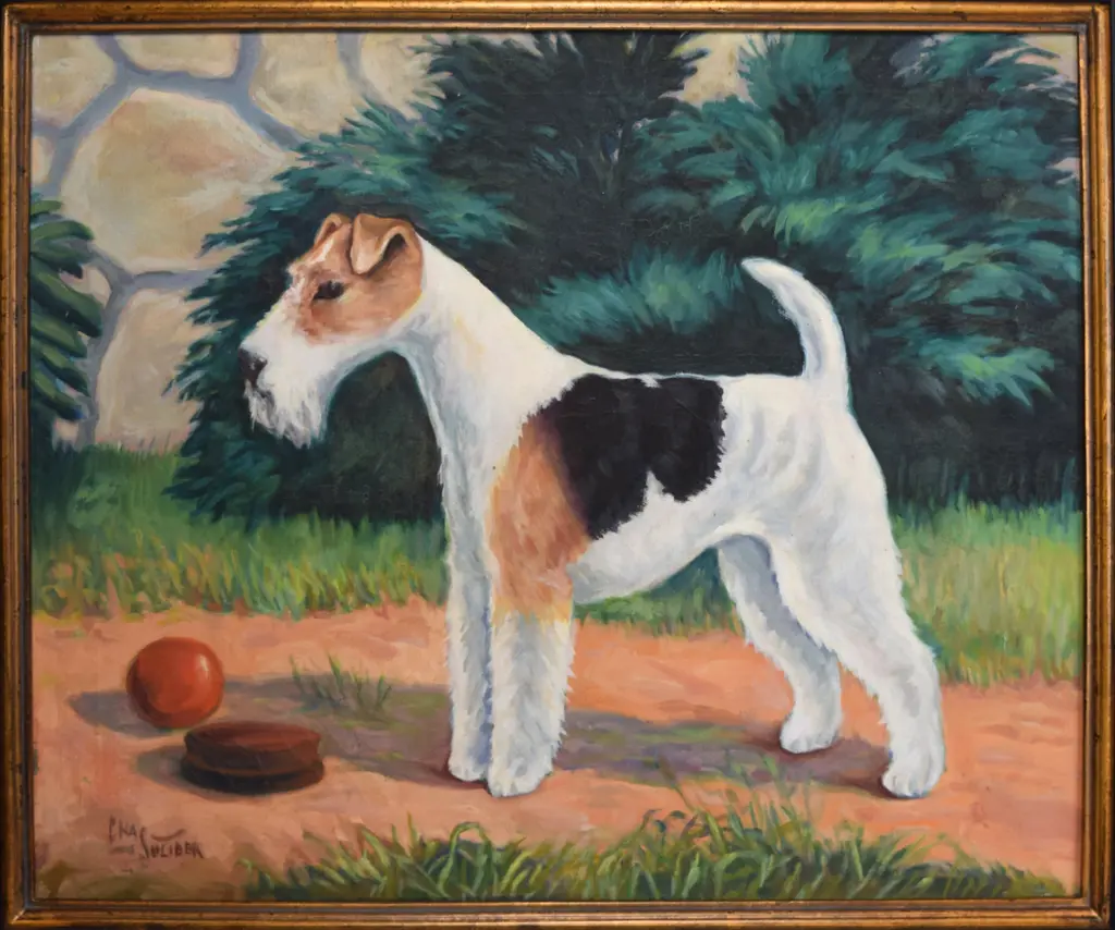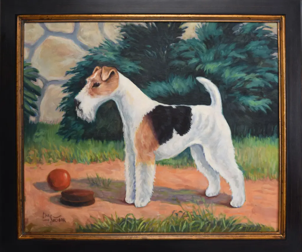 Early 20th Century antique dog portrait of a wire haired fox terrier with ball and bowl. Oil on canvas, signed lower right Charles Soliber.. Presented in a Black and gilt wood frame with notched details. Circa 1920s-1940s.Dimensions:Canvas: 20x24"Frame: 26.5"x30.5"