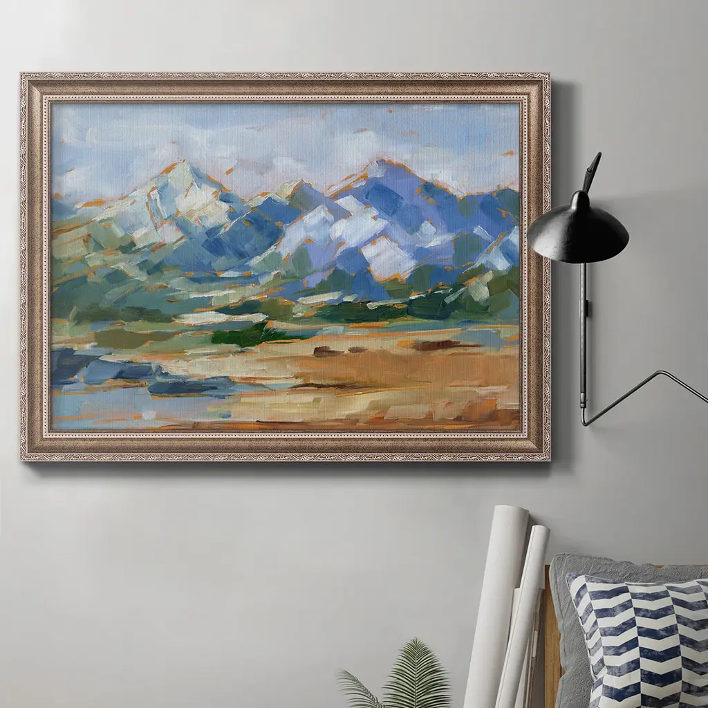 This is a mountainous landscape impressionist oil painting by the talented listed artist William Hawkins on an artist's canvas panel. Hawkins, from Tucson, Arizona, is known for his colorful brushwork and use of lighting. The painting is initialed "WH" in the lower left and stamped on the reverse. The beautifully antiqued silver-gilt wood frame and hanging hardware/wire are included. Dimensions: The artwork is 8”L x 10”H; overall, including the frame, it is 14.5”L x 16.5"H. Excellent condition!!