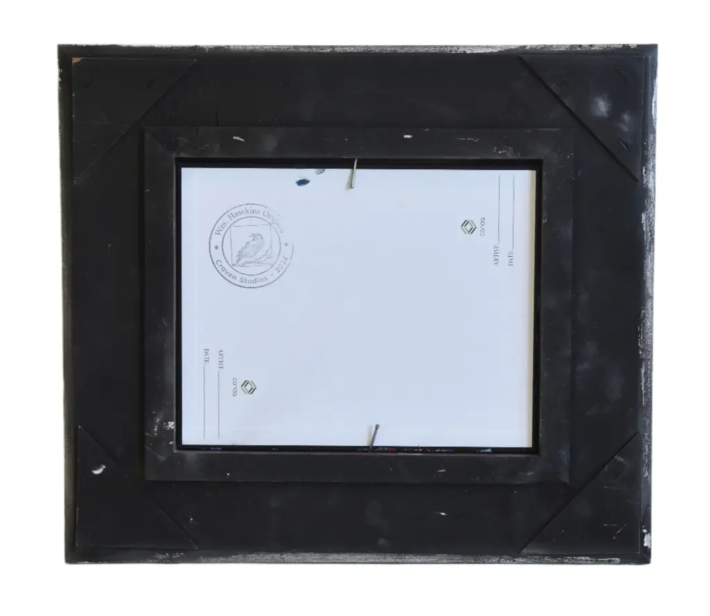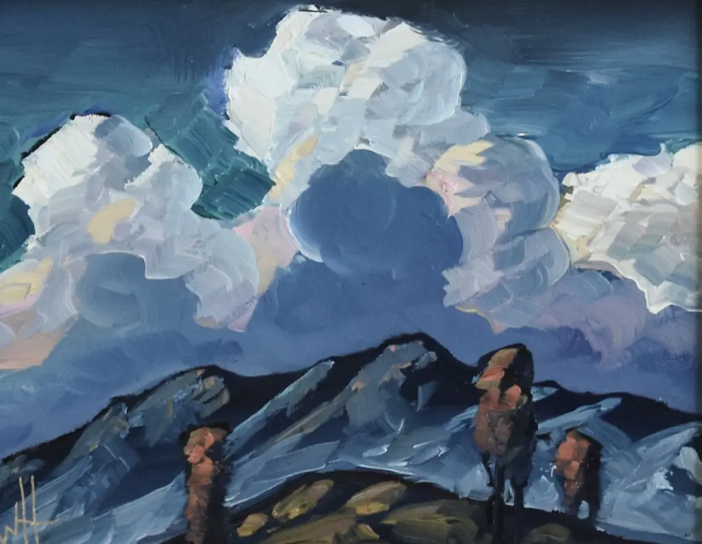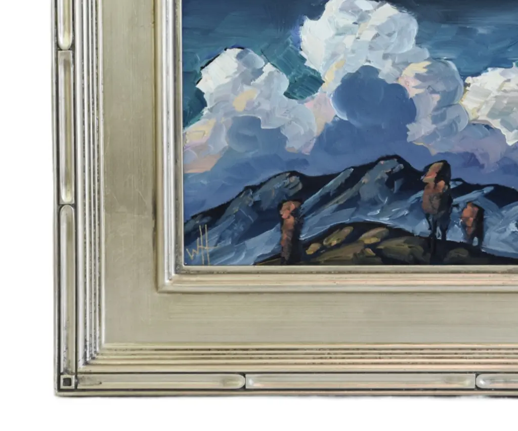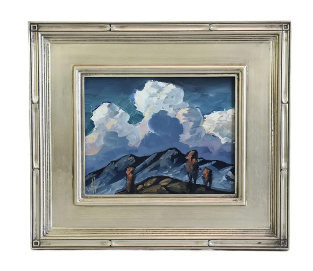 Original puffy clouds landscape impressionist oil painting on artist����������s canvas panel by the talented listed artist William Hawkins. Hawkins, from Tucson, Arizona, is known for his colorful brushwork and use of lighting. The painting is initialed "WH" in the lower left and stamped on the reverse. Included is the beautifully antiqued silver gilt wood frame and hanging hardware/wire. Dimensions: The artwork is 10”L x 8���H; overall, including the frame, it is 16.5”L x 14.5"H. Excellent condition!!