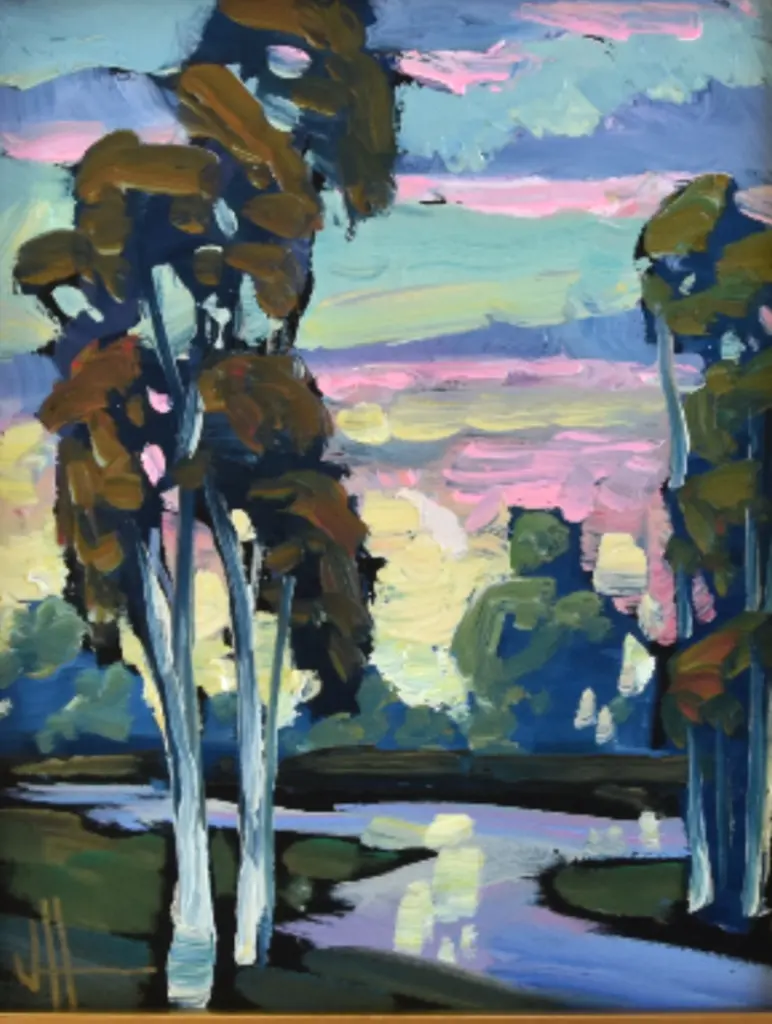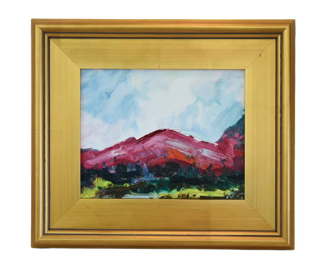 Original stream and landscape Impressionist oil painting on artist’s canvas panel by listed artist William Hawkins. Hawkins is a talented impressionist painter from Tucson, Arizona, known for his colorful brushwork and use of lighting. Initialed "WH" in the lower left corner and stamped on the reverse. Included is an antiqued gold wood frame and hanging hardware/wire. Dimensions: Artwork, 8"L x 10”H; overall, including the frame, 13�������L x 15��H. Excellent condition!!!!