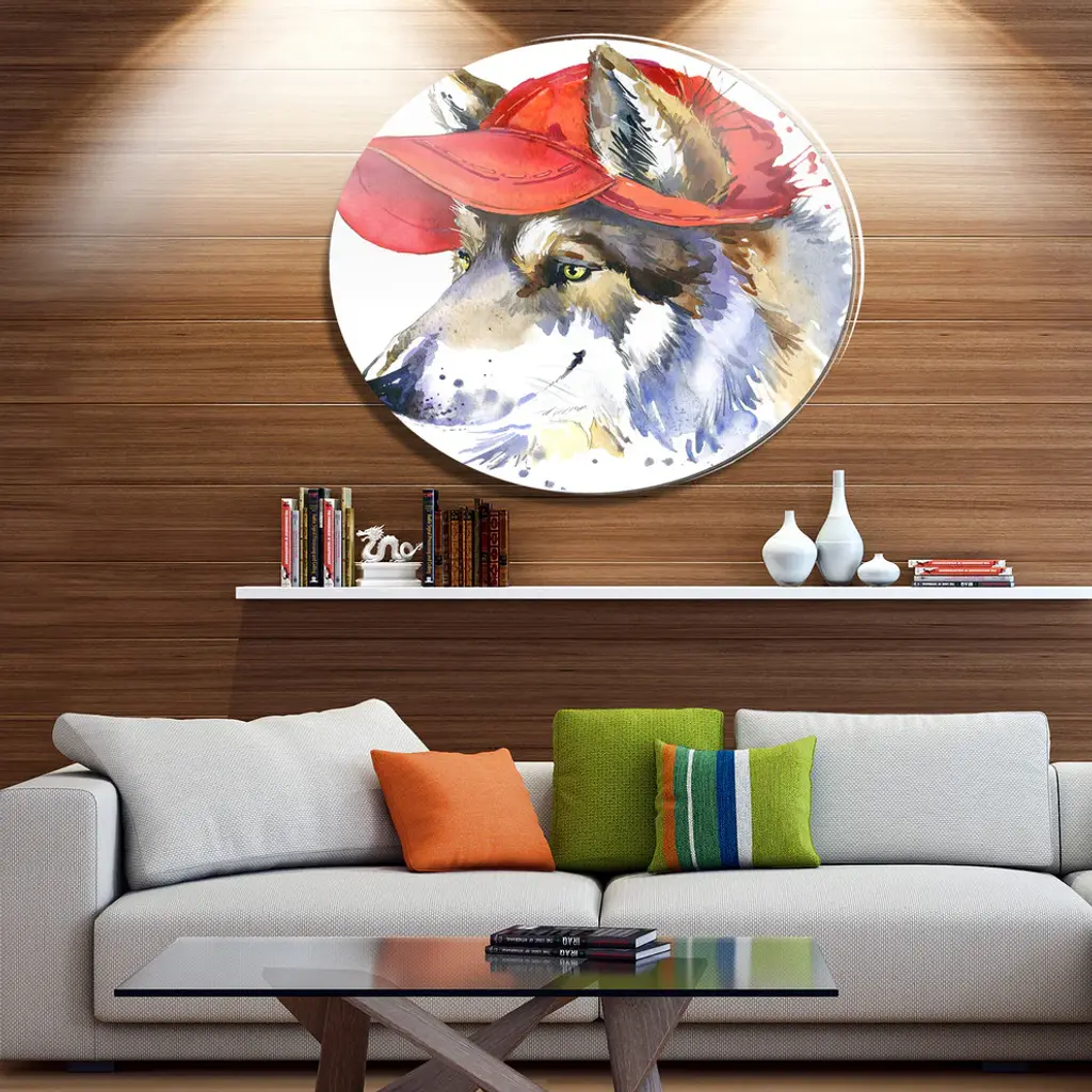 Bring Contemporary Abstraction to your home with this large Circle Metal wall art. This Wolf with Red Cap Illustration Metal Artwork makes it the focal point of any room or office. - White Gloss Coating ensures colors are extra vibrant with light reflection.- Aluminum grade Sheet Metal with 1 inch mounting frame on the back giving the illusion that the artwork is floating on the wall..- Mounting Brackets are included along with instructions.- High Quality Digital images are created directly into a glossy aluminum panel producing a stunning and captivating print into the glossy finish of the metal.- Water, Fire and Scratch resistant HD Aluminum panels.- Looks better than any photo paper and guaranteed to last at least 20 years- Easy to clean with a microfiber cloth. Colors are far superior to regular Canvas Art. - Easy to Hang