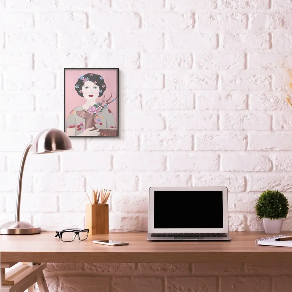 Woman And Deer Pink Animal Painting, 11"x14"