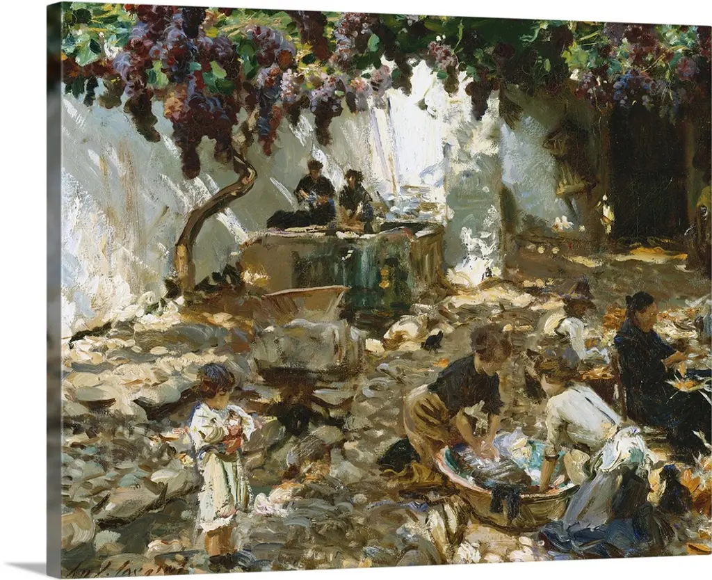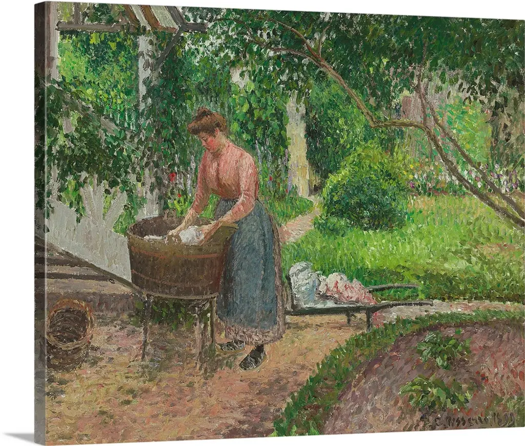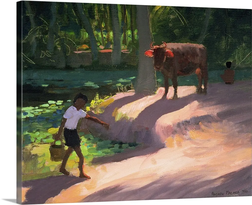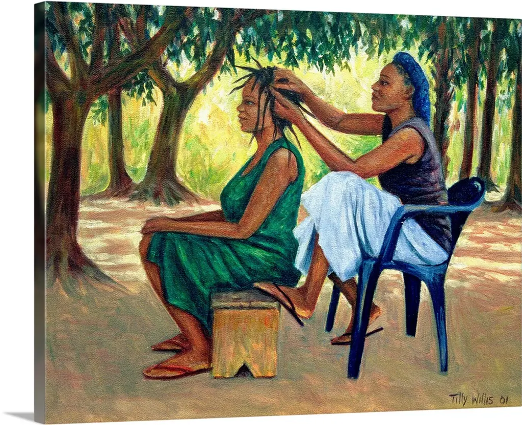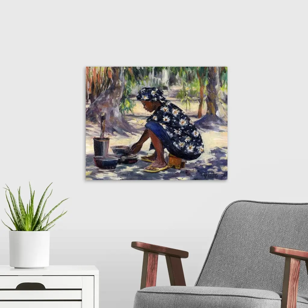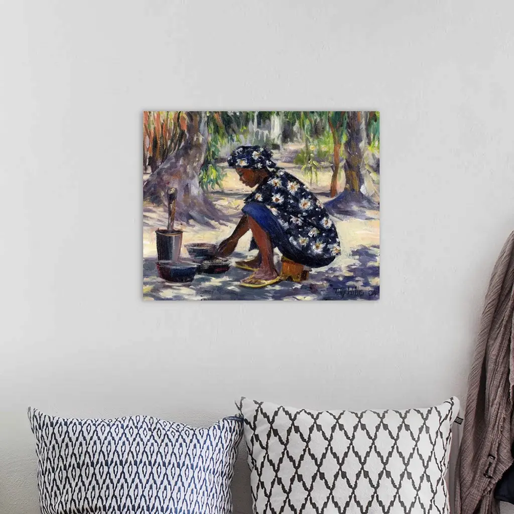 Horizontal painting on a big wall hanging of an African American woman in floral clothing, squatting beneath shade trees as she cooks in several pots on the ground.