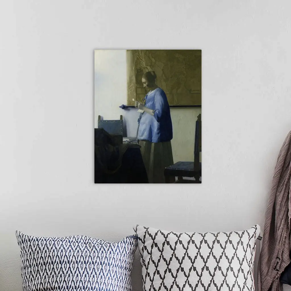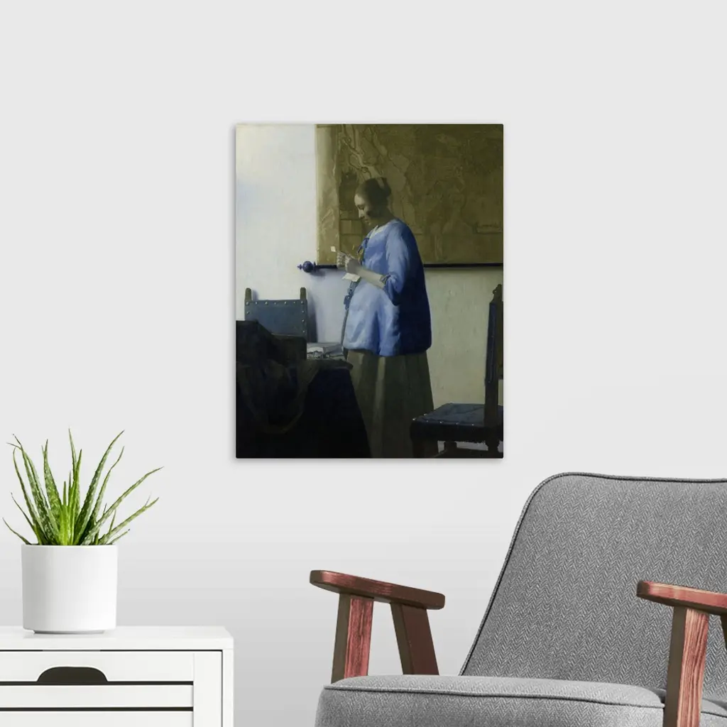 Woman Reading a Letter, by Johannes Vermeer, 1663, Dutch painting, oil on canvas. A young woman in a blue jacket, stands by a table with chairs. A large map hangs on the wall behind her.