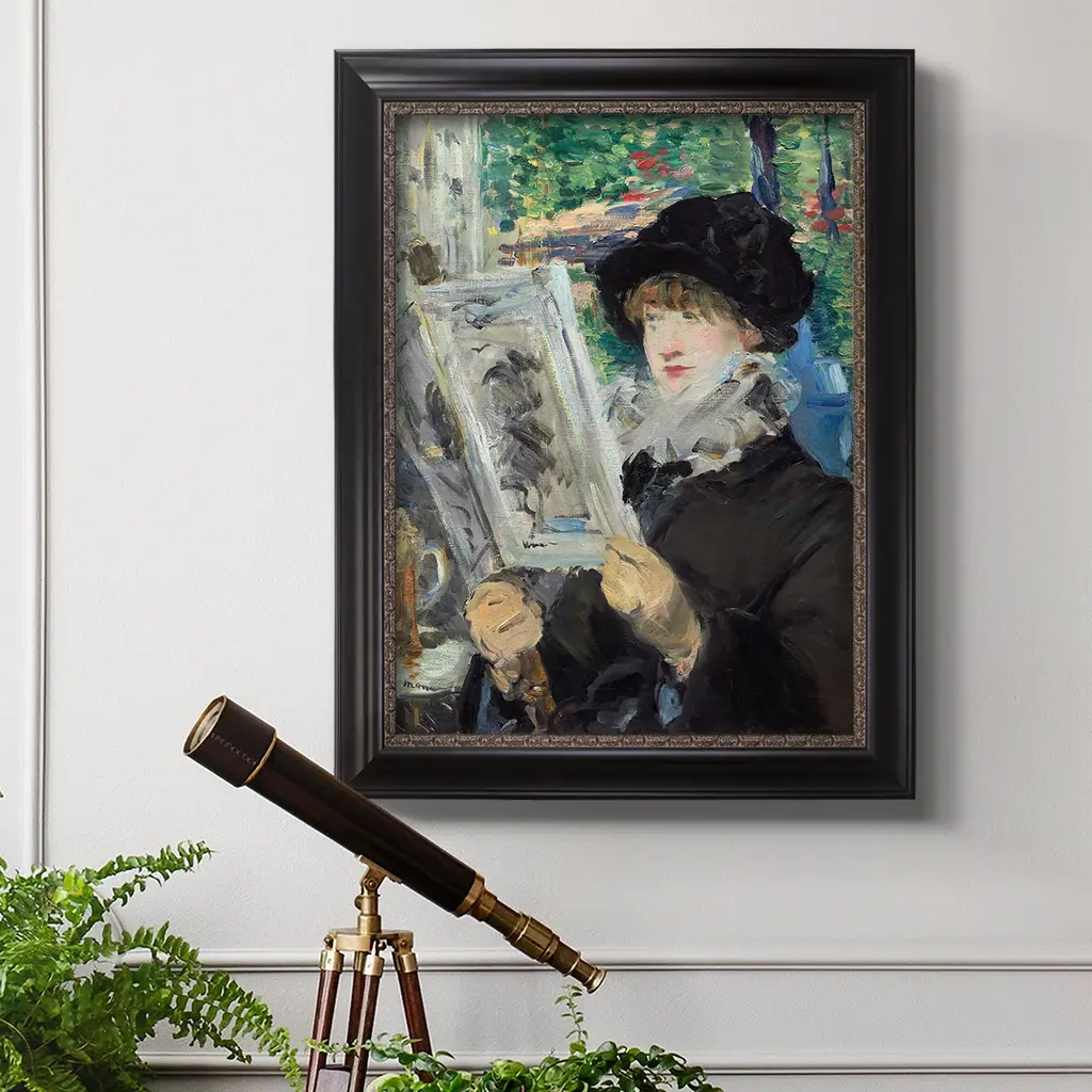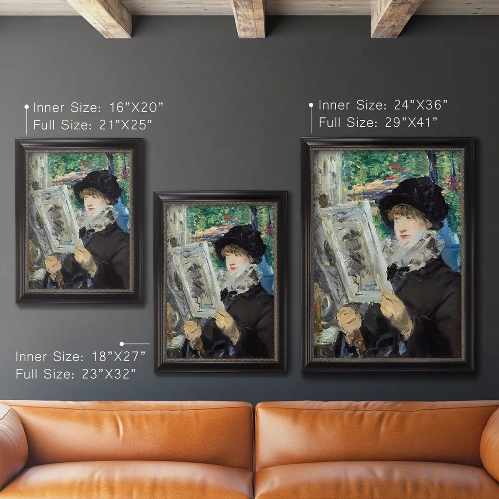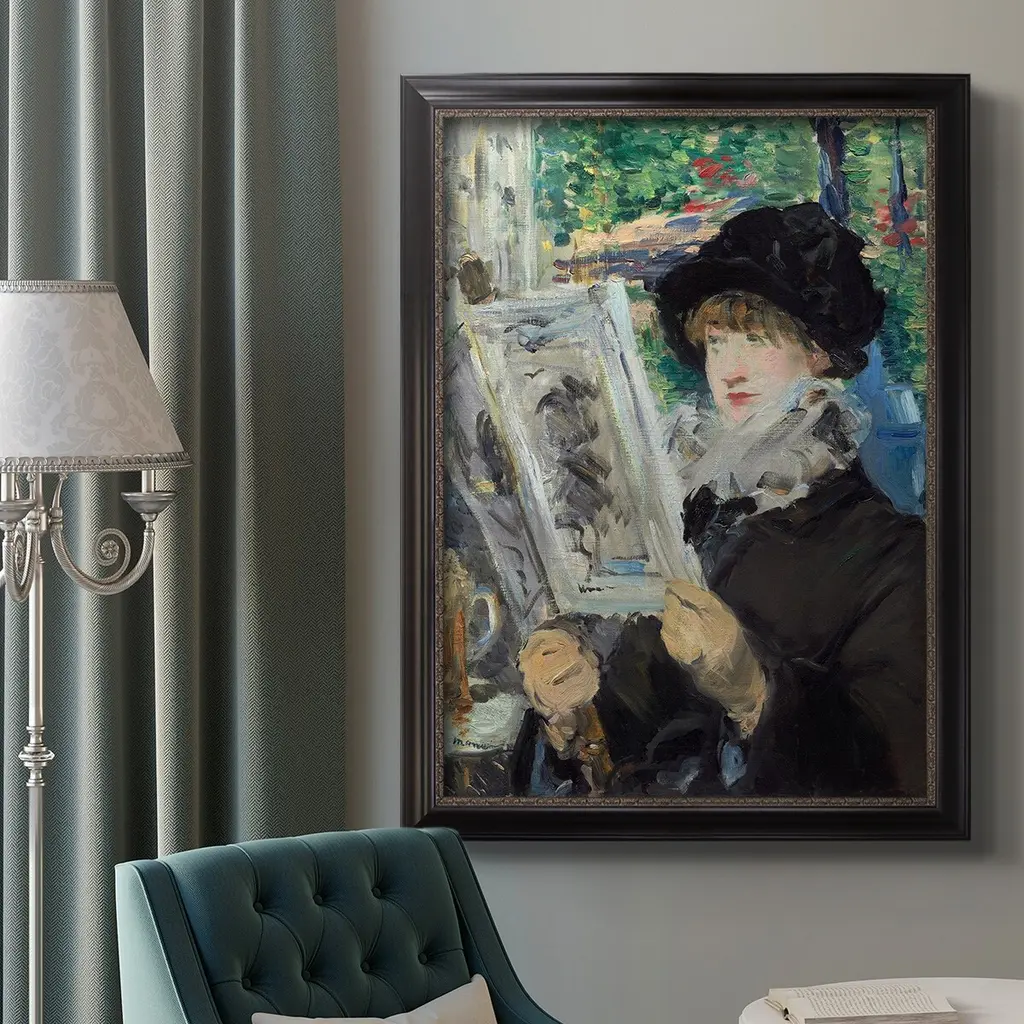 Woman Reading Premium Framed Canvas- Ready to Hang A Premium Framed Canvas created to last. Framed in distressed wood and available in an array of sizes and colors Featuring a beveled a solid wood stretcher bar, each piece comes ready to hand 3 SIZES AVAILABLE 16''X20'' - Overall Size 18'X27'' - Overall Size 24''x36'' - Overall Size Each piece is made to order. Each piece comes with hanging hardware. Made in the USA Ready to Hang Giclee Paper Print Acrylic Glass Beveled Matt Board