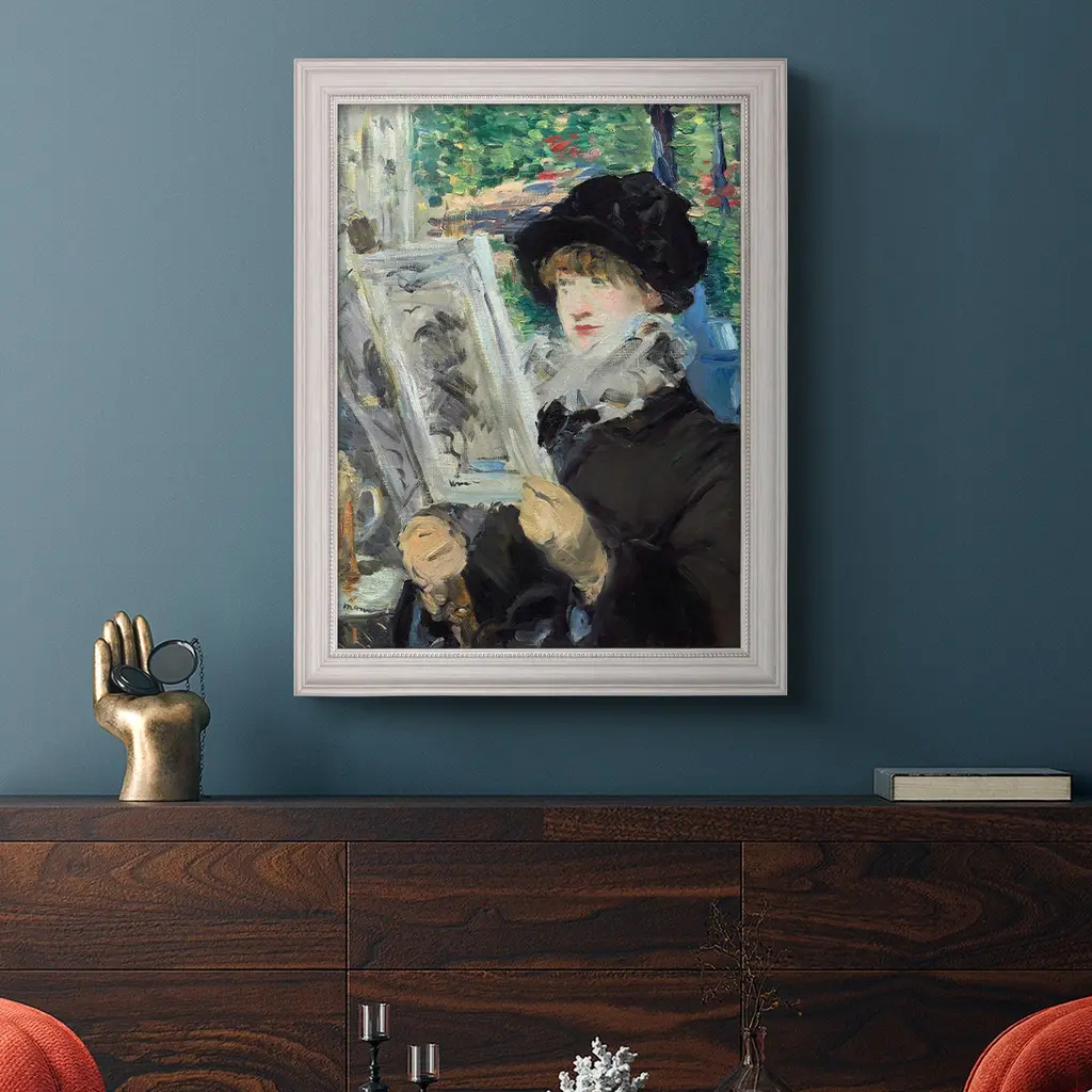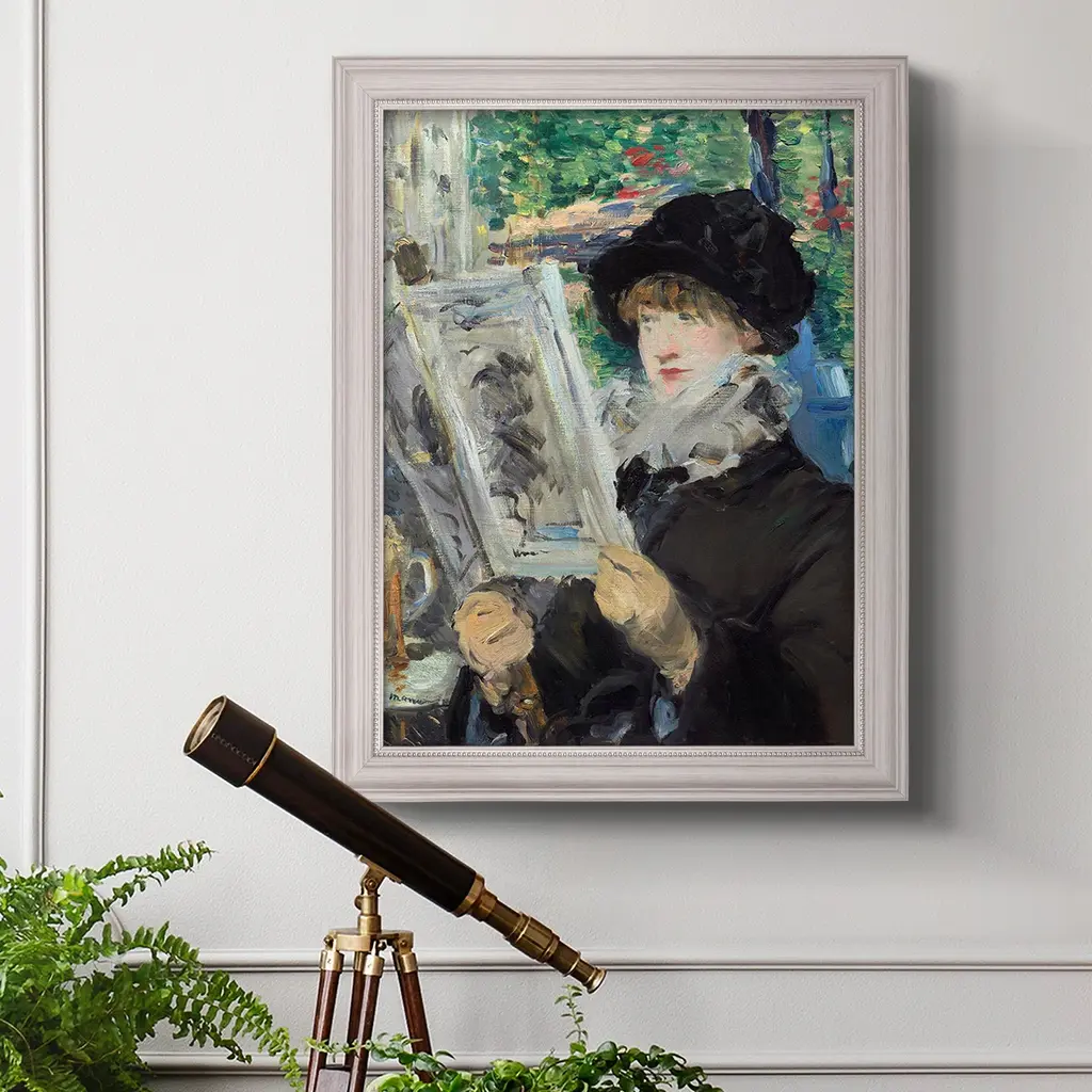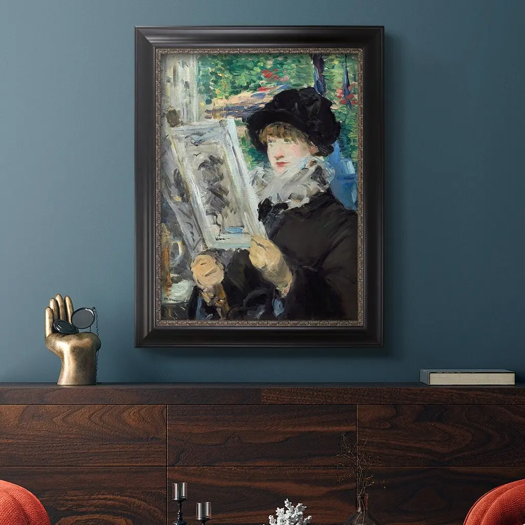 Woman Reading Premium Framed Canvas- Ready to Hang A Premium Framed Canvas created to last. Framed in distressed wood and available in an array of sizes and colors Featuring a beveled a solid wood stretcher bar, each piece comes ready to hand 3 SIZES AVAILABLE 16''X20'' - Overall Size 18'X27'' - Overall Size 24''x36'' - Overall Size Each piece is made to order. Each piece comes with hanging hardware. Made in the USA Ready to Hang Giclee Paper Print Acrylic Glass Beveled Matt Board