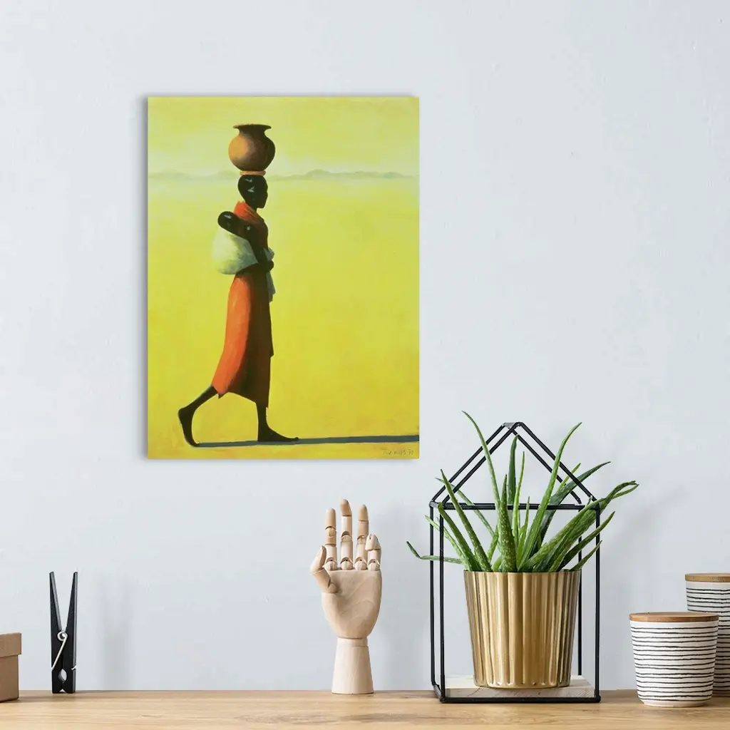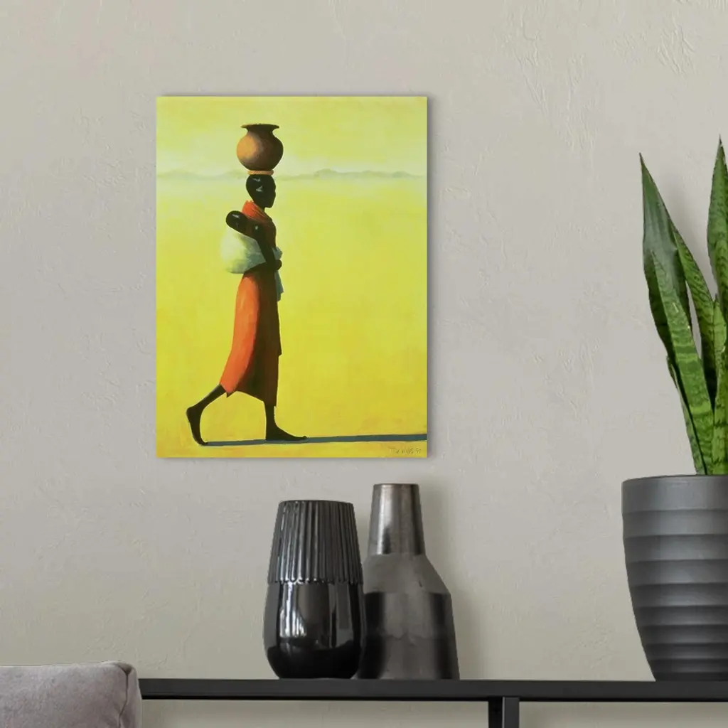 This vertical painting shows a single African woman walking through the desert with an urn balanced on her head and a baby in a sling around her waist.