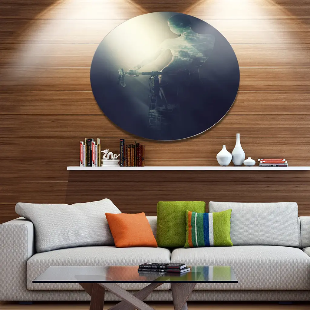 Bring Contemporary Abstraction to your home with this large Circle Metal wall art. This Woman with Bicycle in Spotlight Metal Artwork makes it the focal point of any room or office. - White Gloss Coating ensures colors are extra vibrant with light reflection.- Aluminum grade Sheet Metal with 1 inch mounting frame on the back giving the illusion that the artwork is floating on the wall..- Mounting Brackets are included along with instructions.- High Quality Digital images are created directly into a glossy aluminum panel producing a stunning and captivating print into the glossy finish of the metal.- Water, Fire and Scratch resistant HD Aluminum panels.- Looks better than any photo paper and guaranteed to last at least 20 years- Easy to clean with a microfiber cloth. Colors are far superior to regular Canvas Art. - Easy to Hang