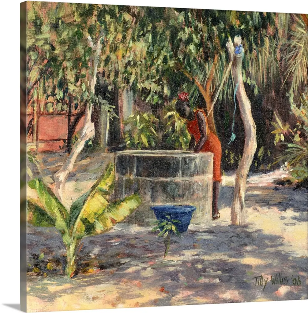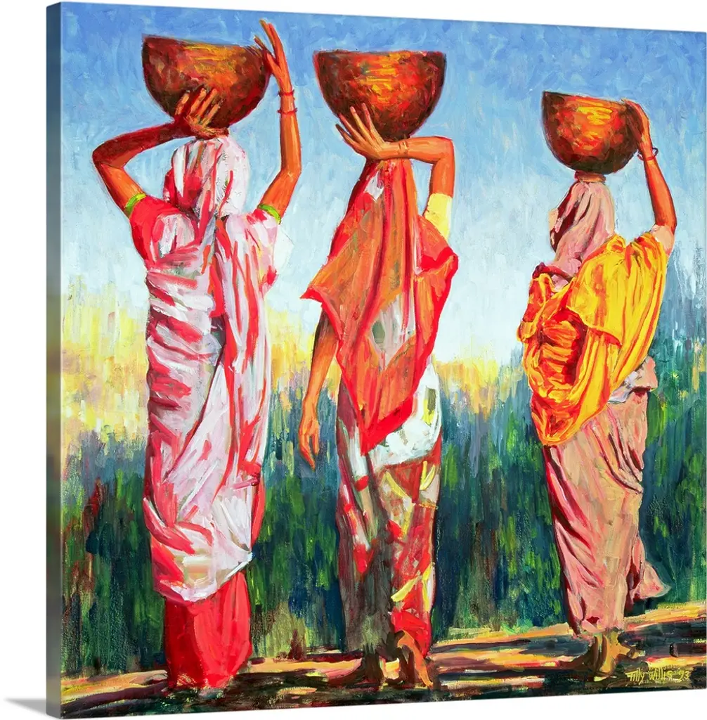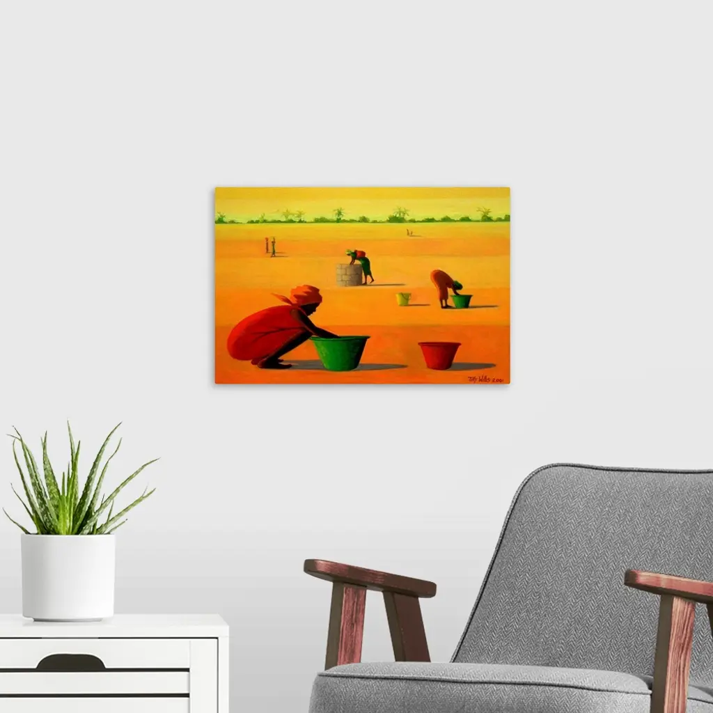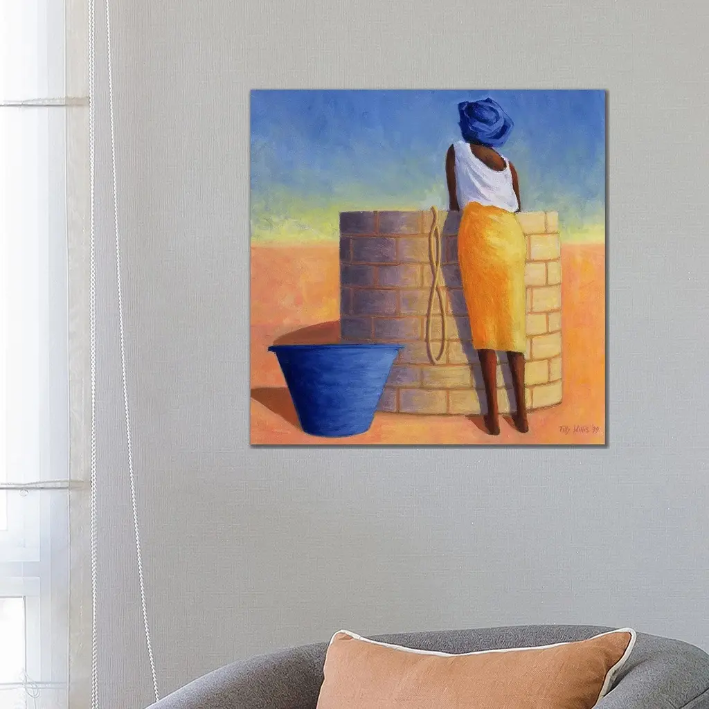 Painting of three women with buckets around a well in the dessert with a small forest on the horizon.