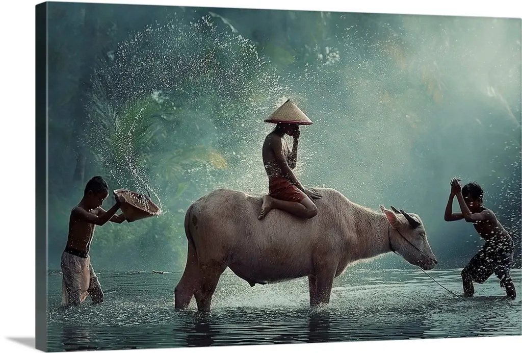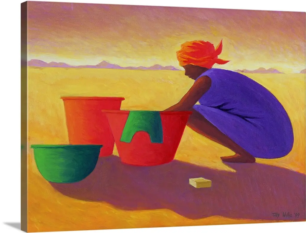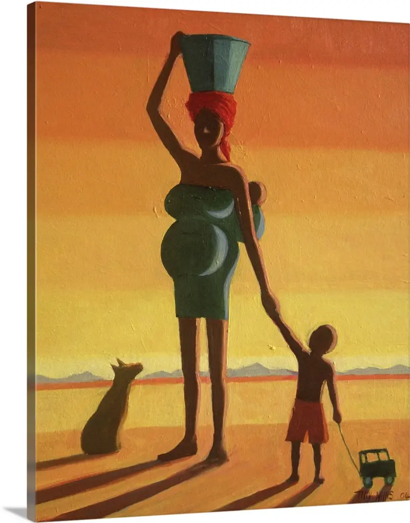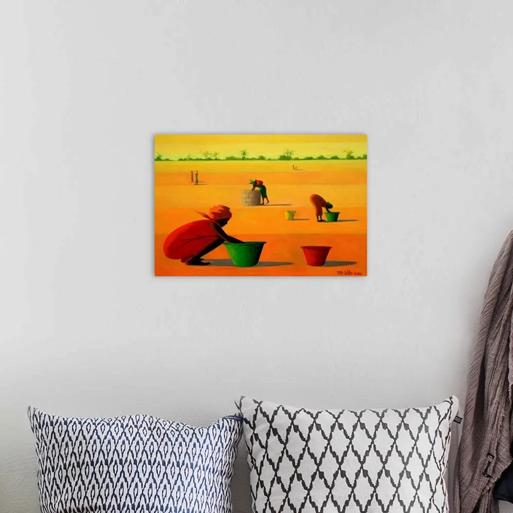 Painting of three women with buckets around a well in the dessert with a small forest on the horizon.
