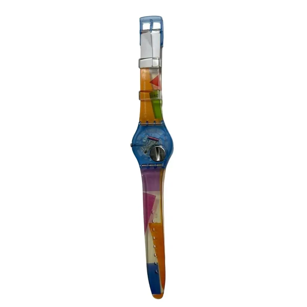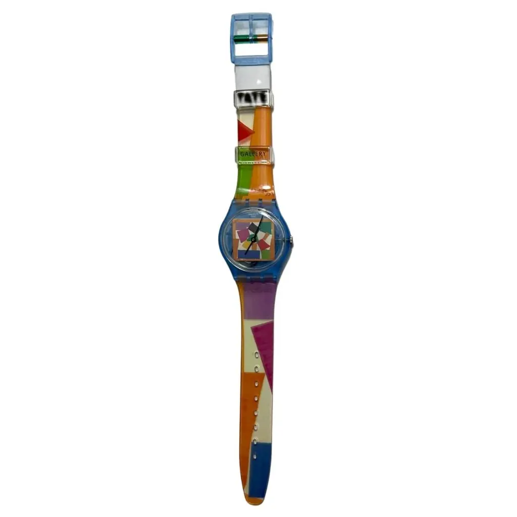 This watch from the Swatch x Tate Gallery Collection has a transparent matte blue biosourced case and biosourced glass. The dial features Henri Matisse's artwork The Snail printed in its entirety and black hour and minute hands. The transparent, shiny strap has a print of the artwork as well as the artist's signature. The transparent, shiny loops are printed with the Tate Gallery logo. Henri Matisse The Snail 1953. © Succession Henri Matisse/DACS 2024. Photo: Tate / © Tate