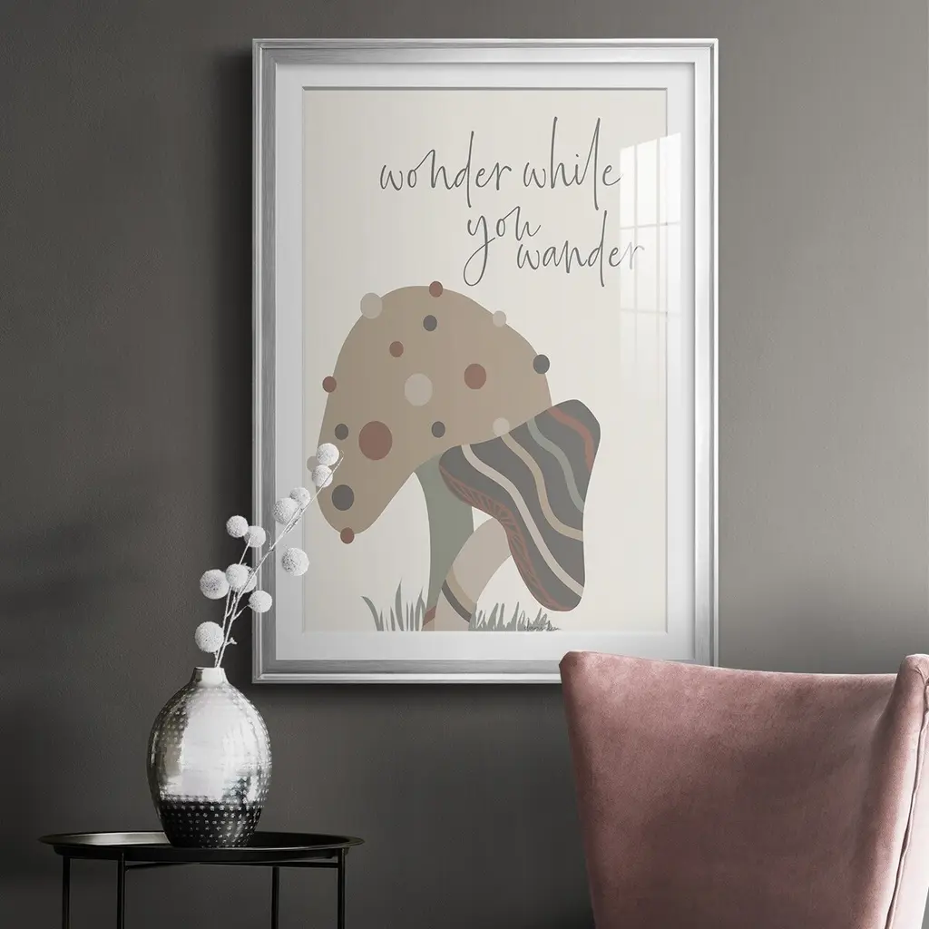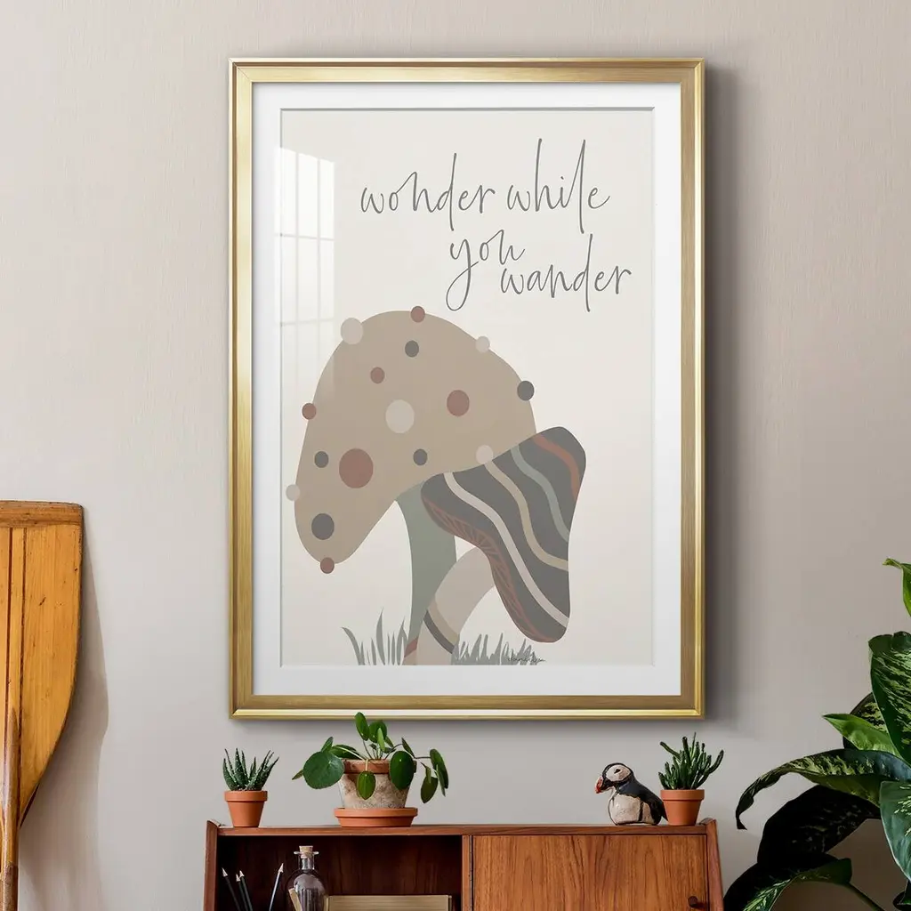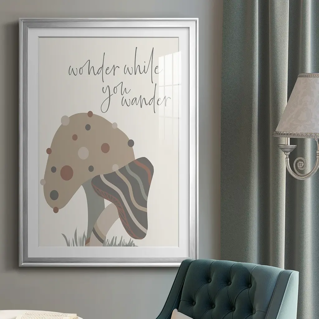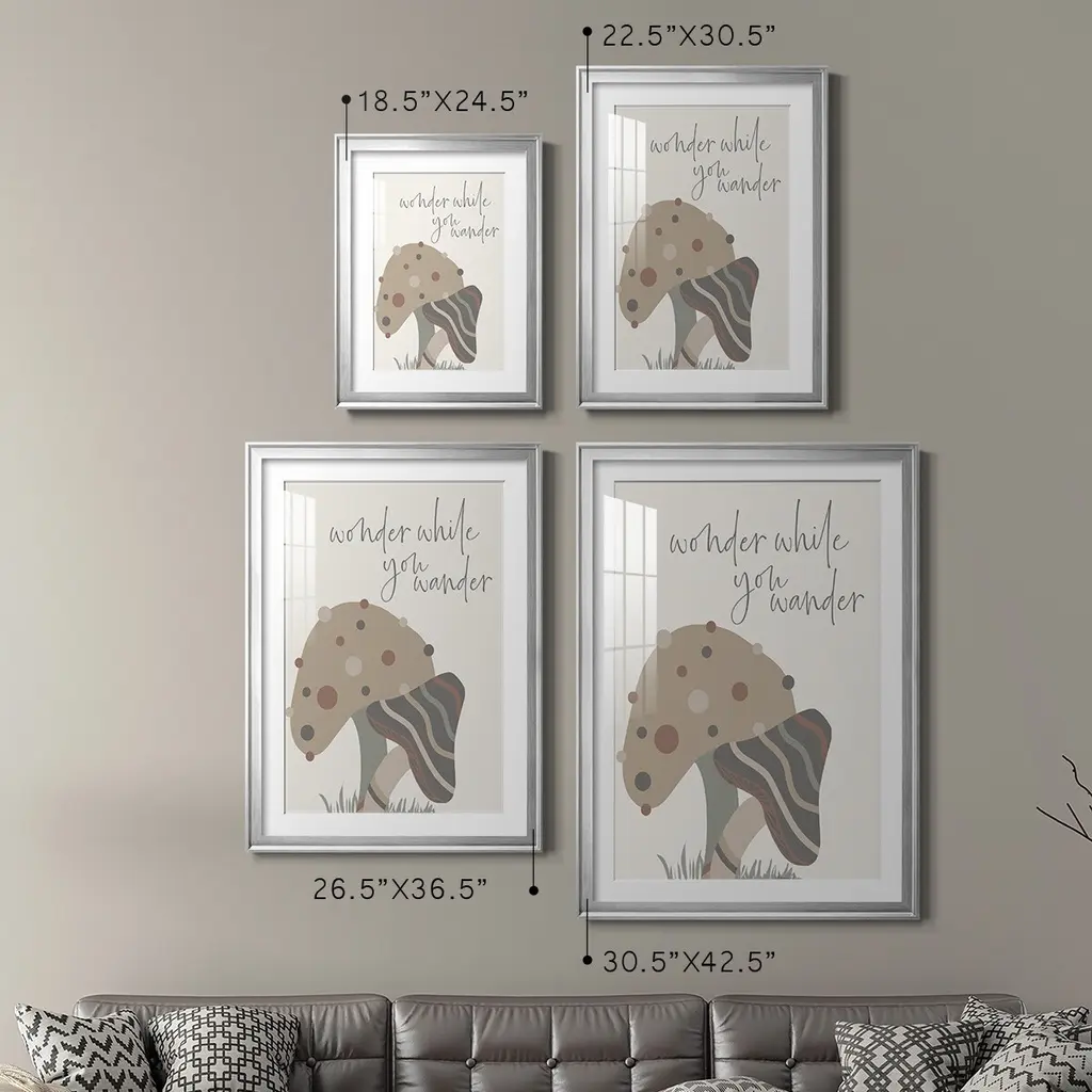 Wonder While You Wander Premium Framed Print - Ready to Hang A Premium Framed Print created to last. Framed in distressed wood and available in an array of sizes and colors Featuring a beveled a solid wood stretcher bar, each piece comes ready to hand 4 SIZES AVAILABLE 30.5''X42.5'' - Overall Size 26.5'X36.5'' - Overall Size 22.5''x30.5'' - Overall Size 18.5''x24.5'' - Overall Size Each piece is made to order. Each piece comes with hanging hardware. Made in the USA Ready to Hang Giclee Paper Print Acrylic Glass Beveled Matt Board