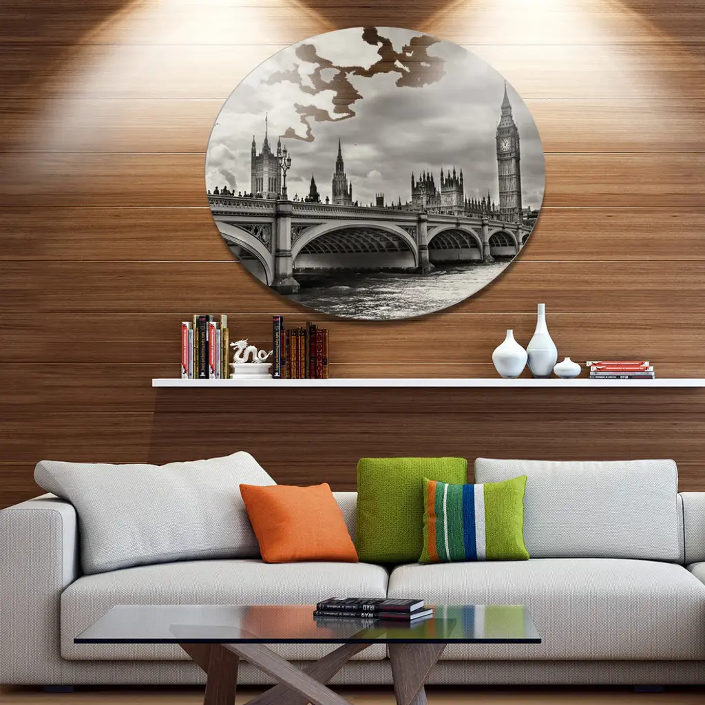 Bring Contemporary Abstraction to your home with this large Circle Metal wall art. This Wonderful View of Westminster Bridge Metal Artwork makes it the focal point of any room or office. - White Gloss Coating ensures colors are extra vibrant with light reflection.- Aluminum grade Sheet Metal with 1 inch mounting frame on the back giving the illusion that the artwork is floating on the wall..- Mounting Brackets are included along with instructions.- High Quality Digital images are created directly into a glossy aluminum panel producing a stunning and captivating print into the glossy finish of the metal.- Water, Fire and Scratch resistant HD Aluminum panels.- Looks better than any photo paper and guaranteed to last at least 20 years- Easy to clean with a microfiber cloth. Colors are far superior to regular Canvas Art. - Easy to Hang