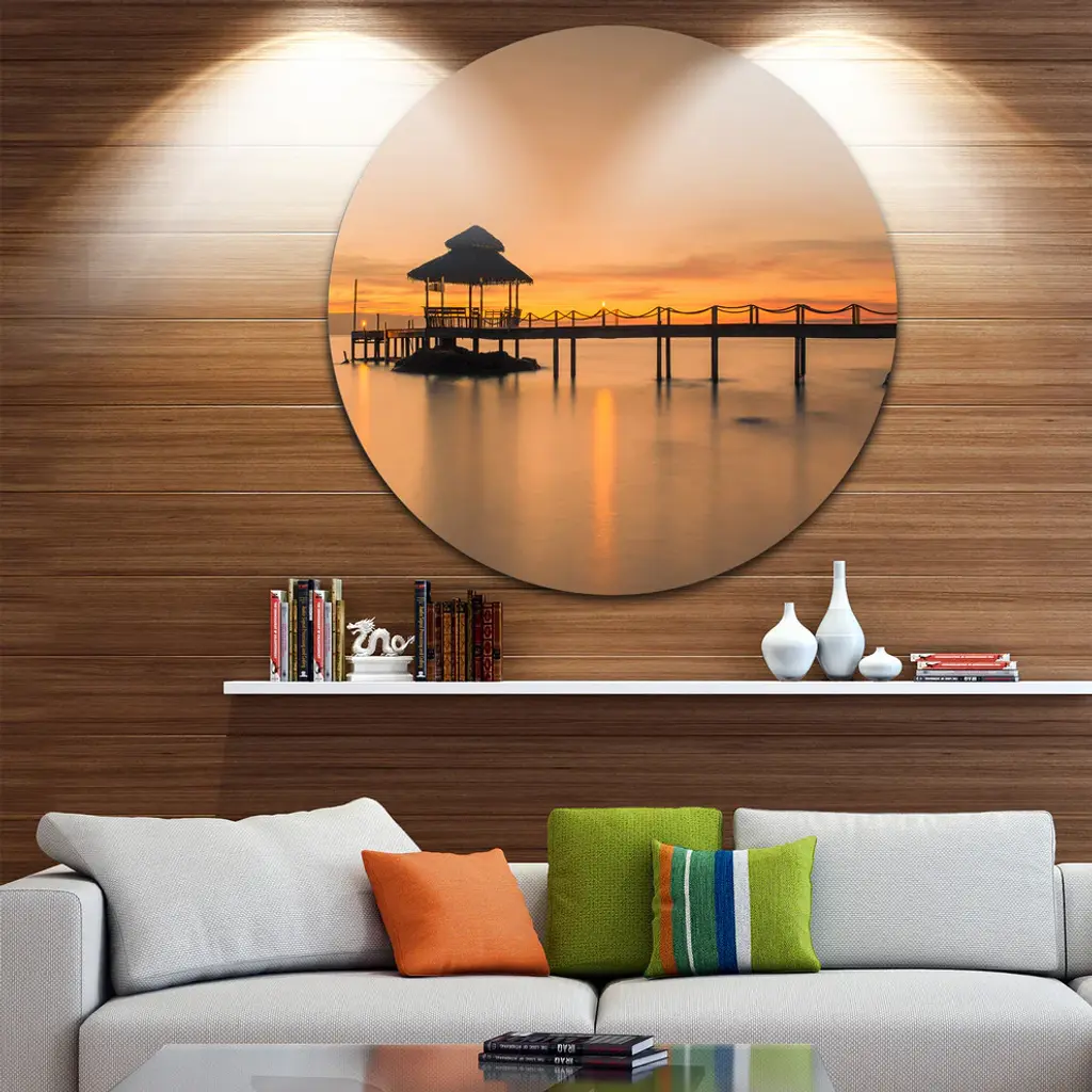 Bring Contemporary Abstraction to your home with this large Circle Metal wall art. This Wonderful Wooden Pier and Hut Phuket Metal Artwork makes it the focal point of any room or office. - White Gloss Coating ensures colors are extra vibrant with light reflection.- Aluminum grade Sheet Metal with 1 inch mounting frame on the back giving the illusion that the artwork is floating on the wall..- Mounting Brackets are included along with instructions.- High Quality Digital images are created directly into a glossy aluminum panel producing a stunning and captivating print into the glossy finish of the metal.- Water, Fire and Scratch resistant HD Aluminum panels.- Looks better than any photo paper and guaranteed to last at least 20 years- Easy to clean with a microfiber cloth. Colors are far superior to regular Canvas Art. - Easy to Hang