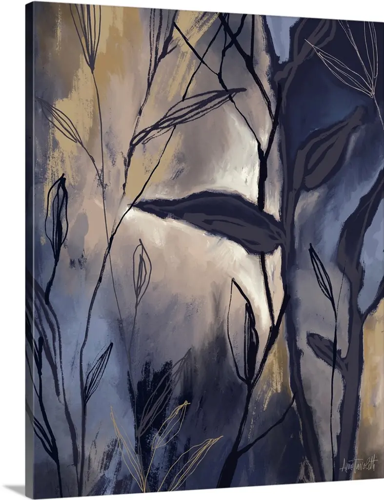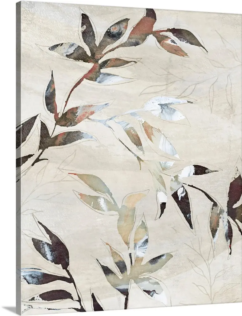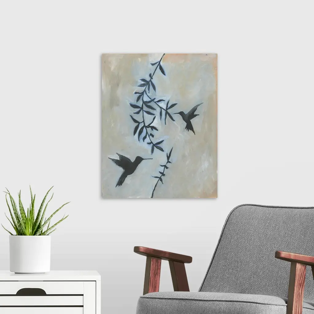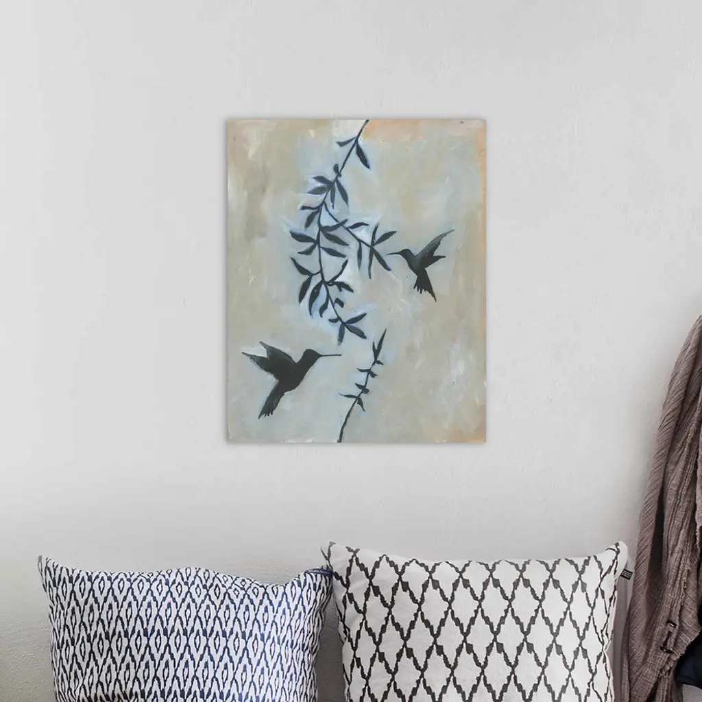 Contemporary artwork of two hummingbirds at a hanging vine.