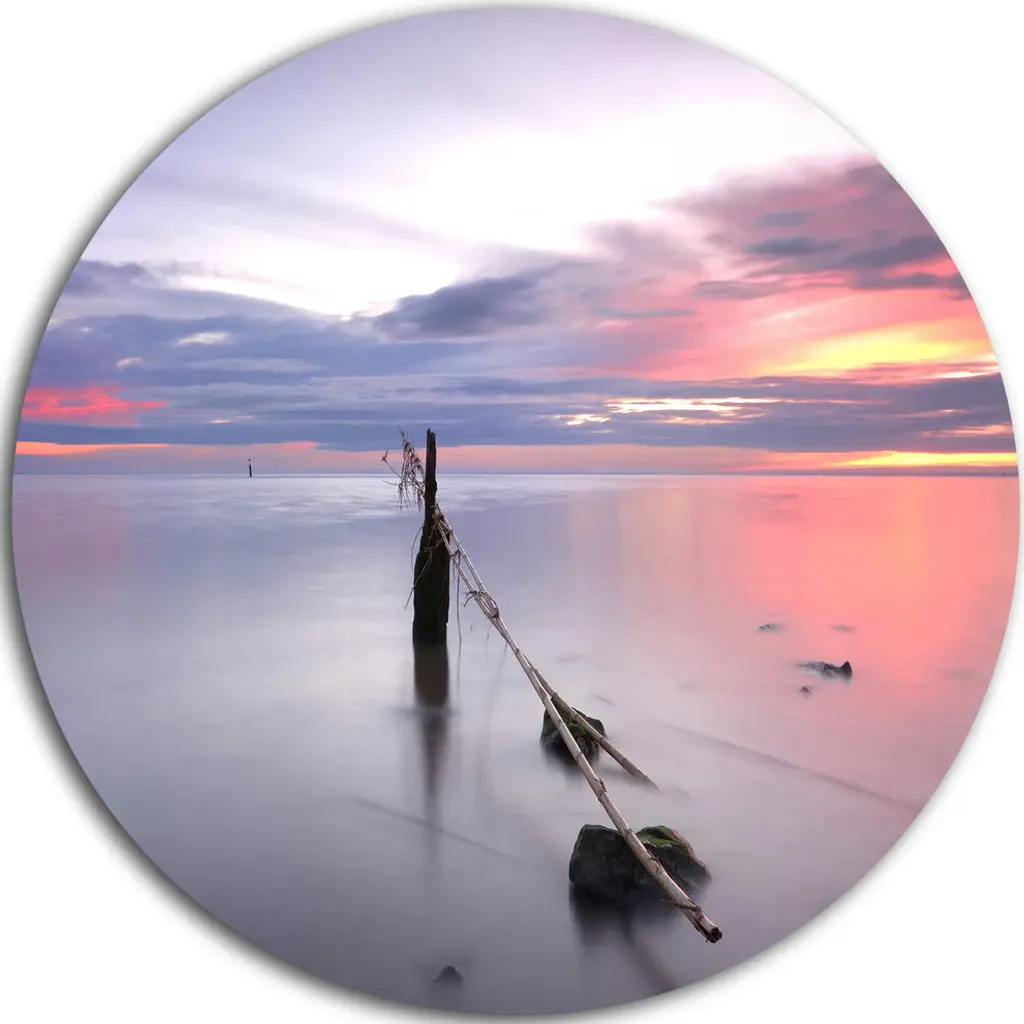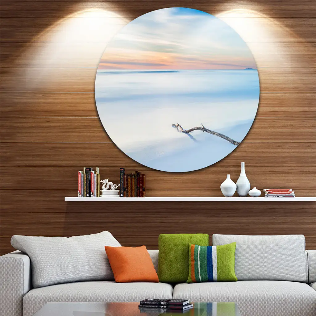 Bring Contemporary Abstraction to your home with this large Circle Metal wall art. This Wood Branch on Beach at Twilight Metal Artwork makes it the focal point of any room or office. - White Gloss Coating ensures colors are extra vibrant with light reflection.- Aluminum grade Sheet Metal with 1 inch mounting frame on the back giving the illusion that the artwork is floating on the wall..- Mounting Brackets are included along with instructions.- High Quality Digital images are created directly into a glossy aluminum panel producing a stunning and captivating print into the glossy finish of the metal.- Water, Fire and Scratch resistant HD Aluminum panels.- Looks better than any photo paper and guaranteed to last at least 20 years- Easy to clean with a microfiber cloth. Colors are far superior to regular Canvas Art. - Easy to Hang