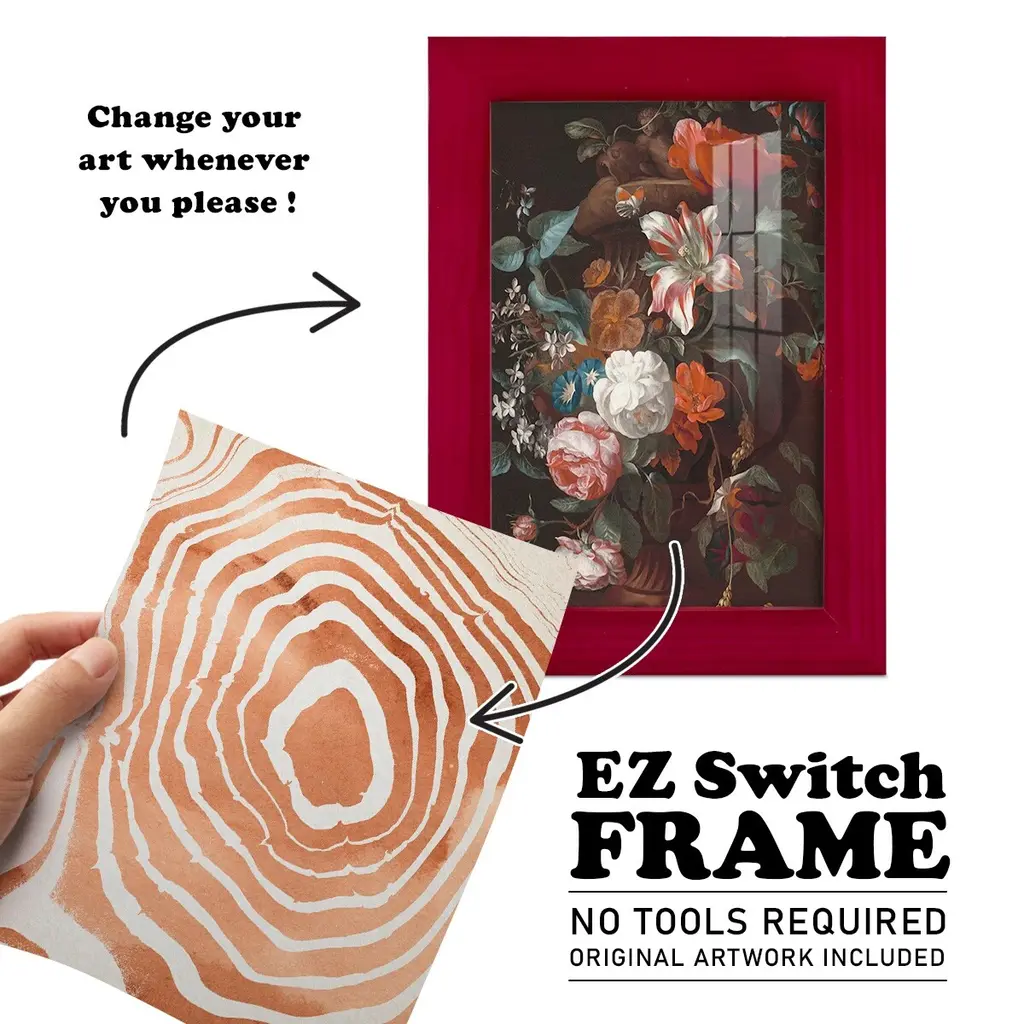 Wood Grain Suminagashi III -EZ SWITCH Framed Print w/glass-Cherry Red A delightful, framed print. Featuring a solid wood frame with real wood glass. This premium print is giclee quality. In addition, every frame features a removable back and table top stand. This allows you to change your art in the future or to just stand the art on a table for a new look. We are sure you'll enjoy our new series of EZ SWITCH Framed Art. Solid Wood Frame Real Glass Removable / Replaceable Art Built in Tabletop Stand Sizes range from 4x6 up to 12x15 - buy just one or pair them up as sets as you see fit.